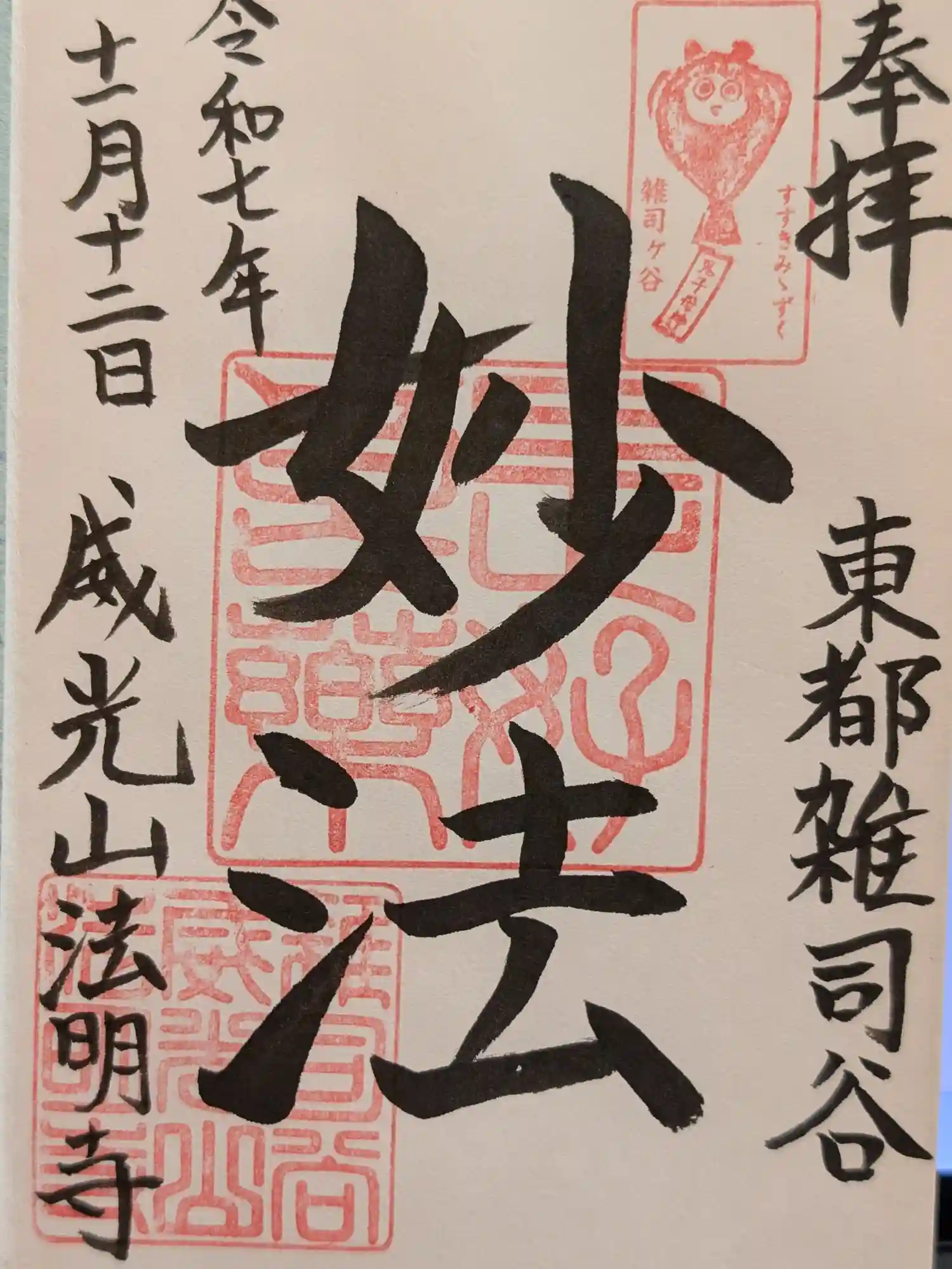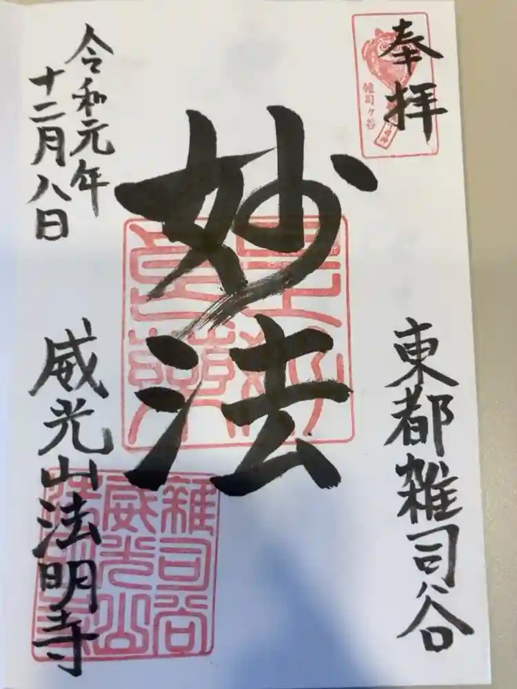 法明寺、鬼子母神堂、法明寺の鎮守である威光稲荷堂をセットで参拝。法明寺では御主題をいただきました。
