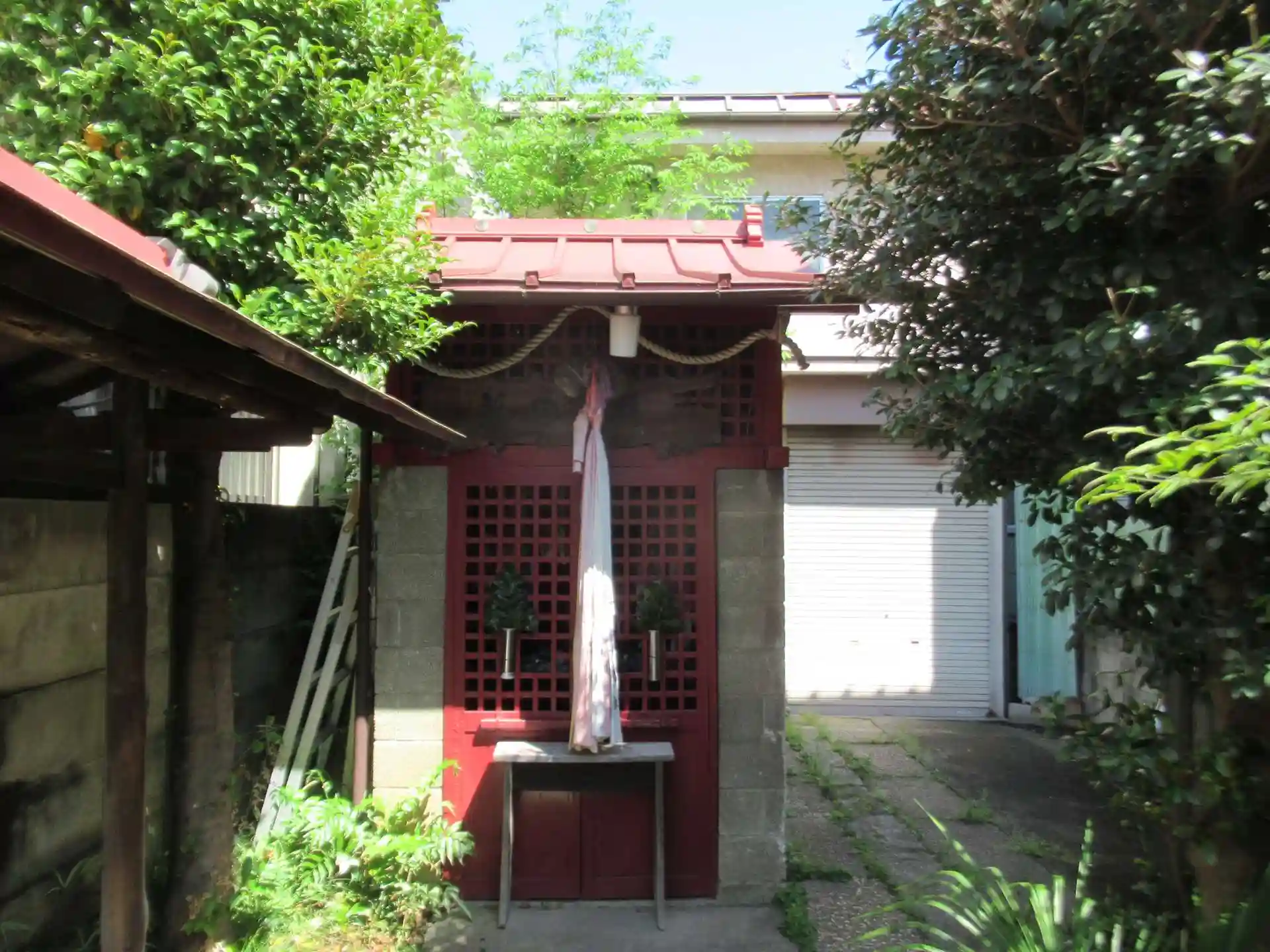 参道には寄進された赤い鳥居がいくつも建ちます。参道は境内に面した住宅の出入り口にもなっています。