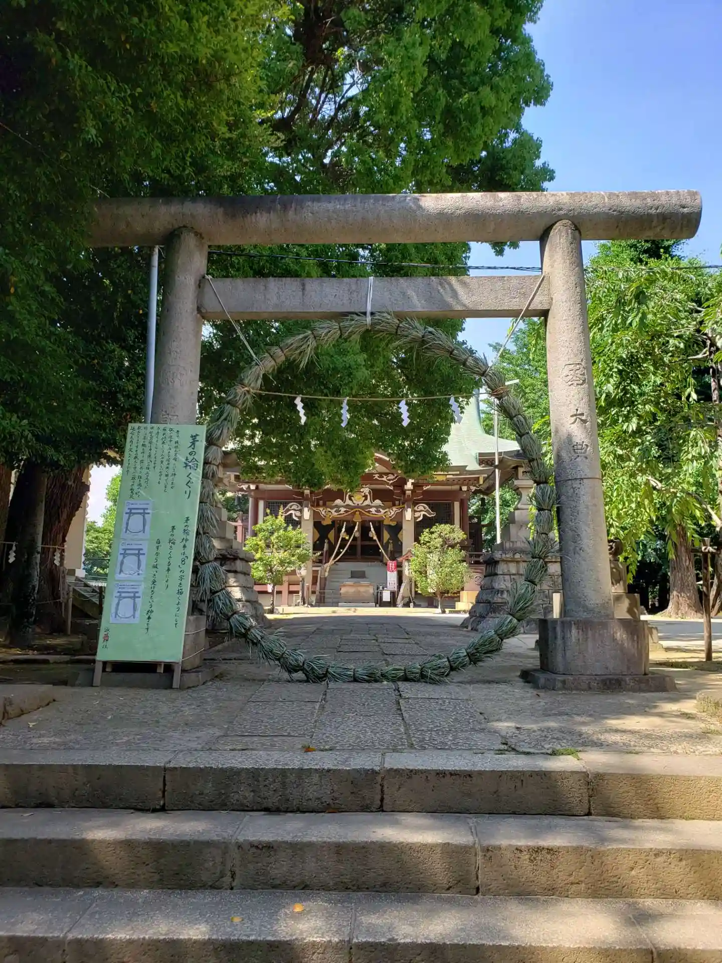 通りに面した大きな鳥居越しに茅の輪が見えました。