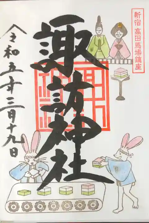 法輪寺から穴八幡宮と放生寺を参拝し、諏訪神社へ。良いお散歩日和です。3月限定の御朱印をいただきました。