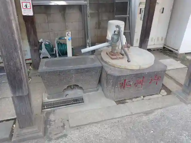 手水鉢の横に井戸があり、手押しポンプがつています。