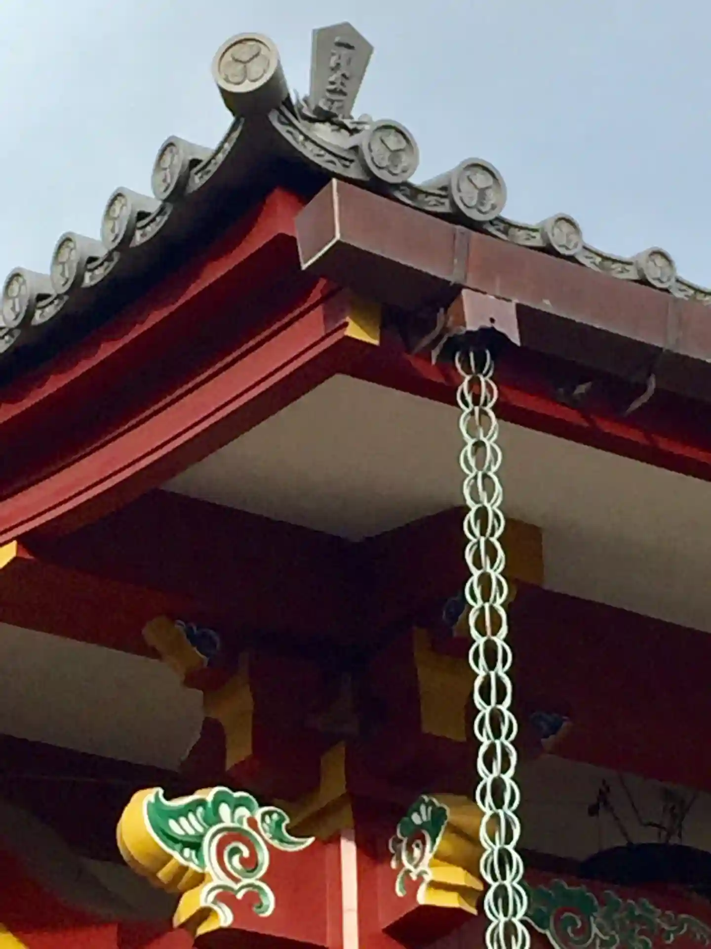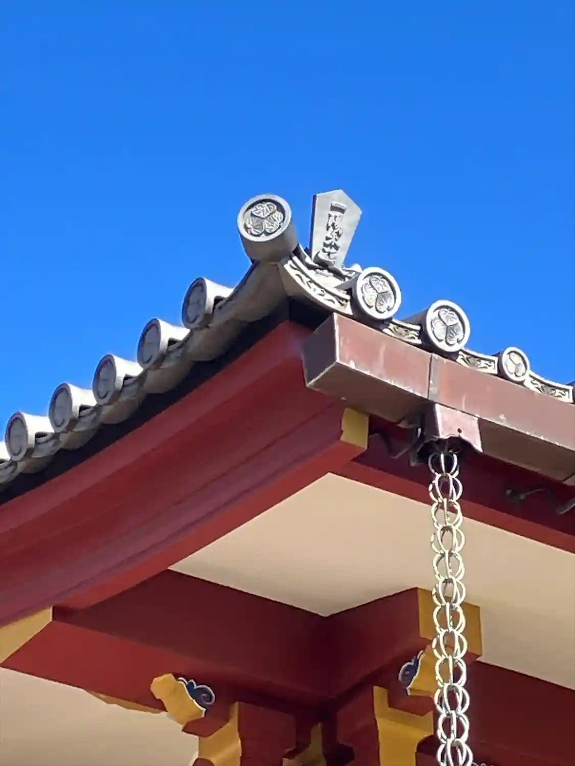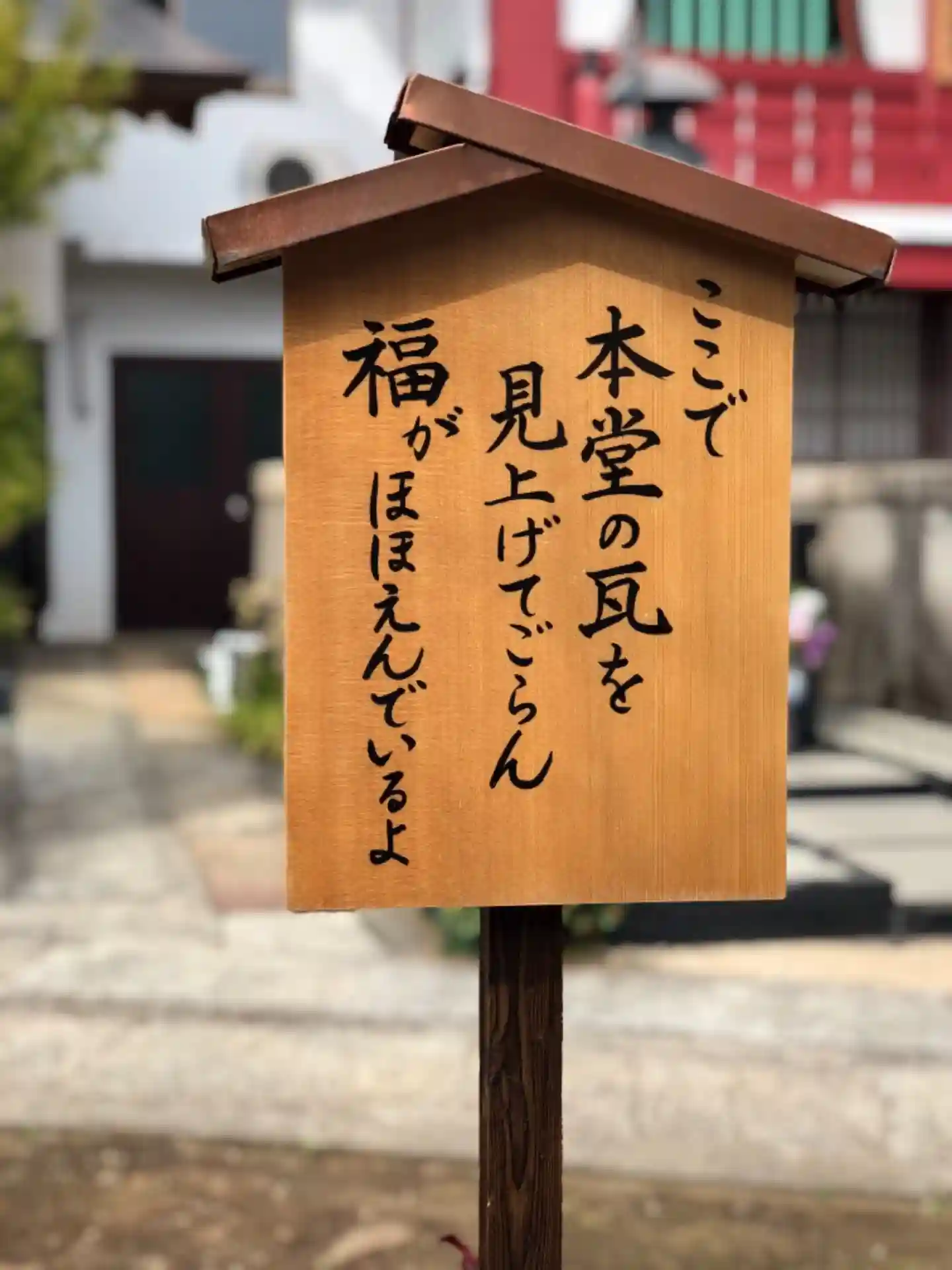 本堂の瓦を見上げてごらん、福がほほえんでいるよ!の看板の指示とおり見上げてみると、瓦が微笑んでいま…