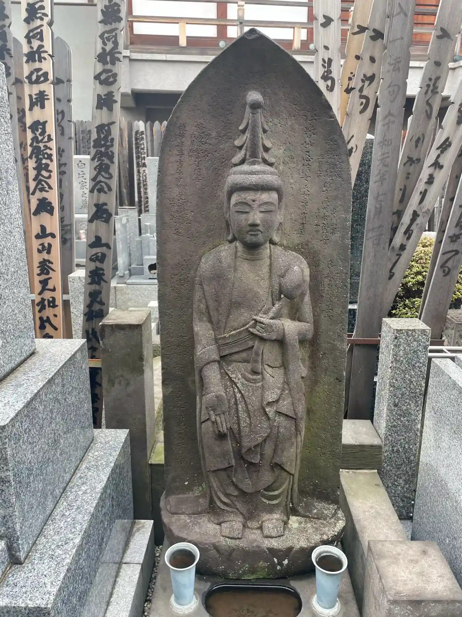 寺の境内に入ってすぐ左手に、立派な板碑型の「庚申塔」が残されています。これは、新宿区指定有形文化財とされています。延宝4年(1676年)に建てられたもので、比較的古いものです。塔の端には、「武州湯原郡牛込馬場下町」としるされています。(中略)