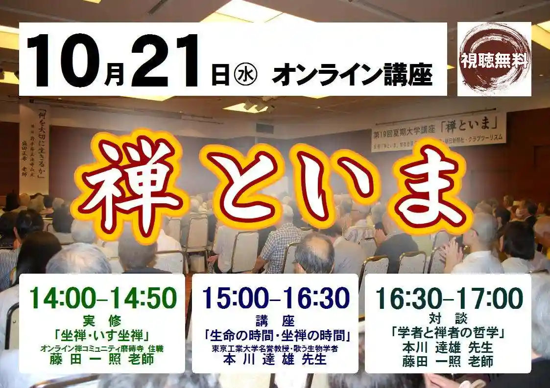 当日は、当講座スタッフ藤田一照老師(オンライン禅コミュニティ磨磚寺住職)による坐禅指導、本川先生の講演後に両師による対談も企画しております。