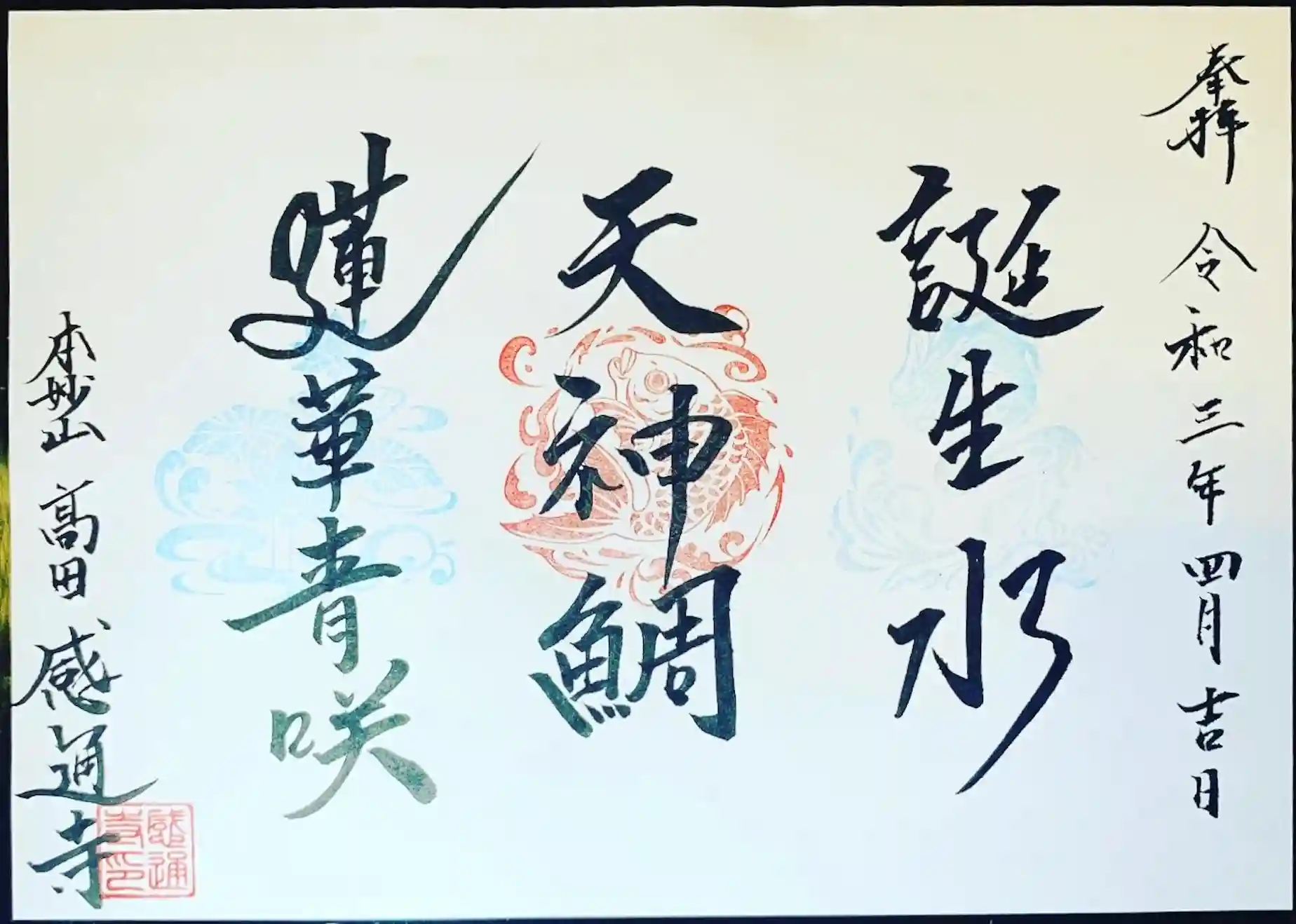 日蓮大聖人は、貞応元年(1222)2月16日、小湊片海の地に降誕されました。その時、庭先から泉が湧き出し産湯に使った「誕生水」、時ならぬ時に浜辺に青蓮華が咲いた「蓮華青咲」、海面に大小の鯛の群れが集まった天津小湊の神の鯛「天神鯛」という不思議な「三喜瑞」をモチーフにした御朱印となっております。