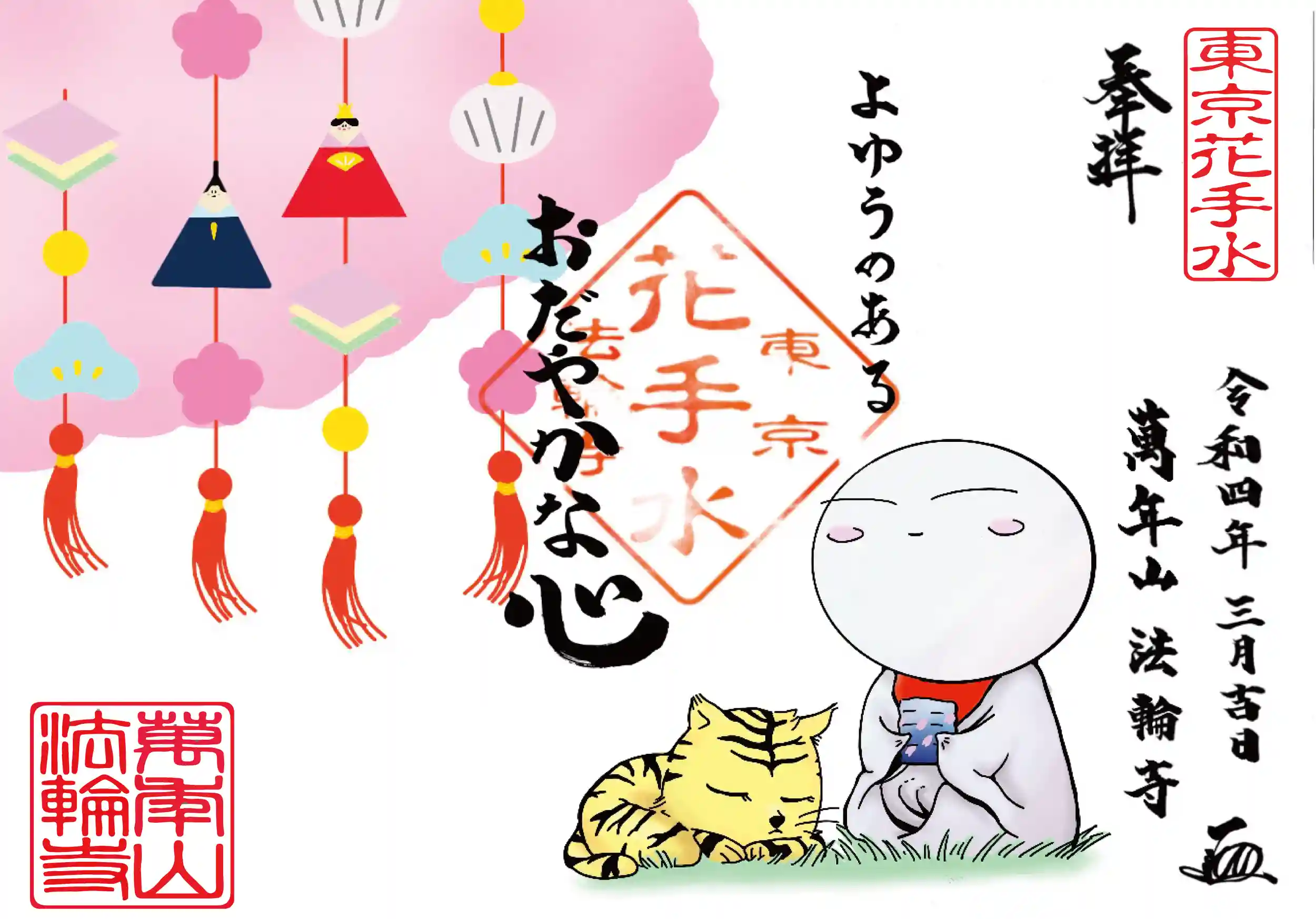 説明:3月のひな祭りを感じさせるお地蔵様の御朱印です。私自身イラストの書き込みが多い作風が好みですが、どなたでも手を取りやすい様に、あえてシンプルに描きました。