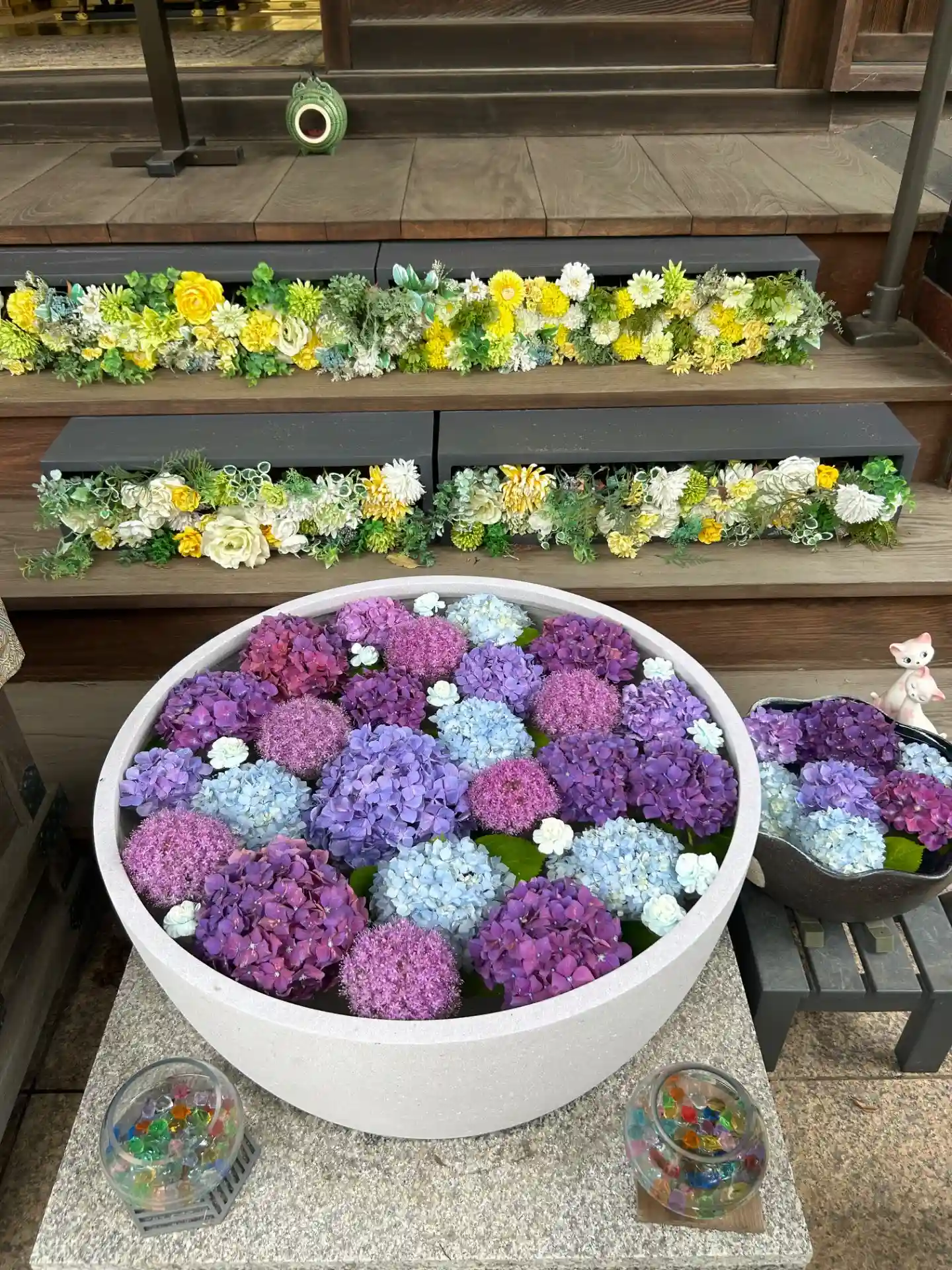 階段を上りきり、右手には紫陽花で飾られた手水がありました。