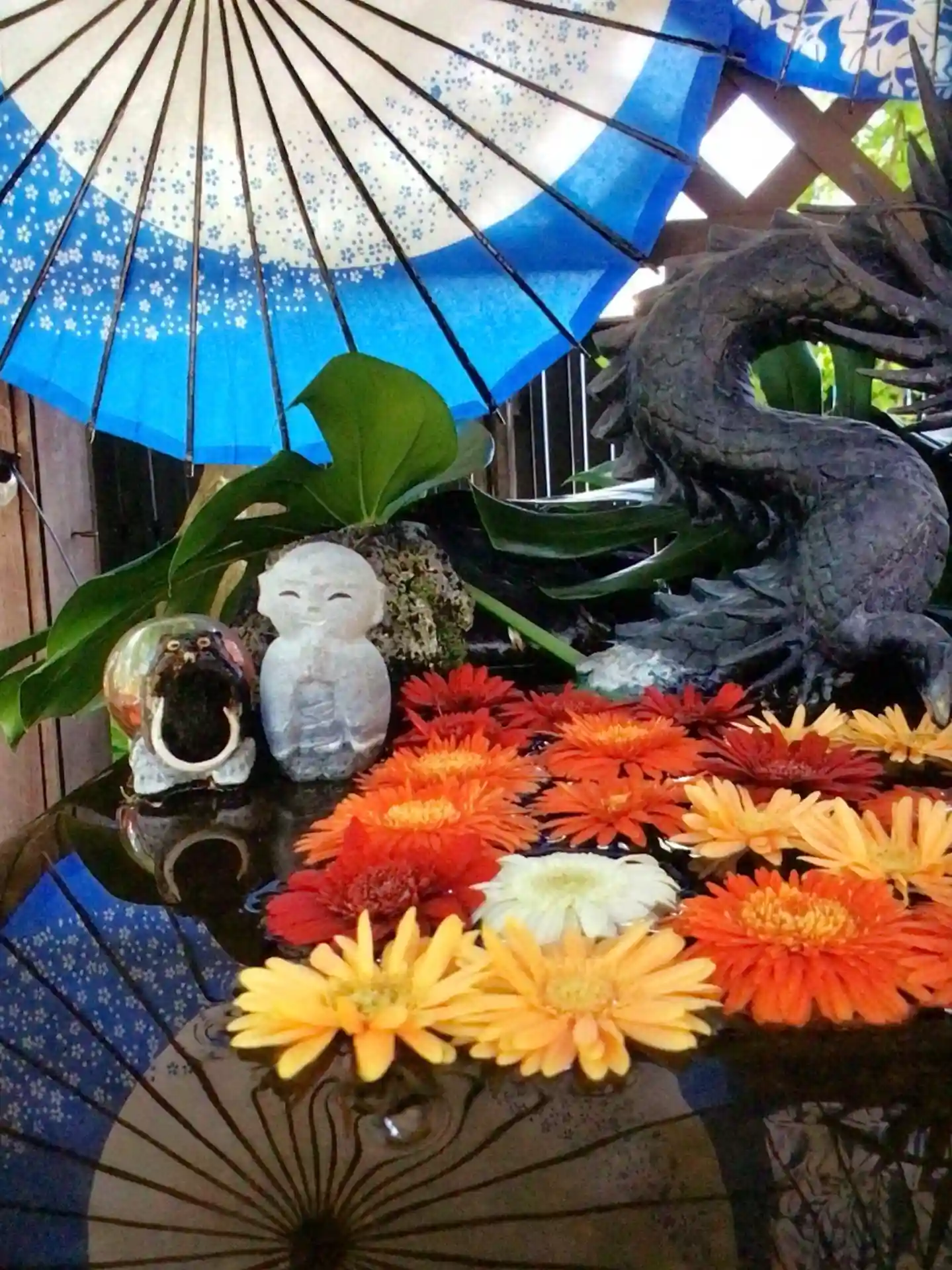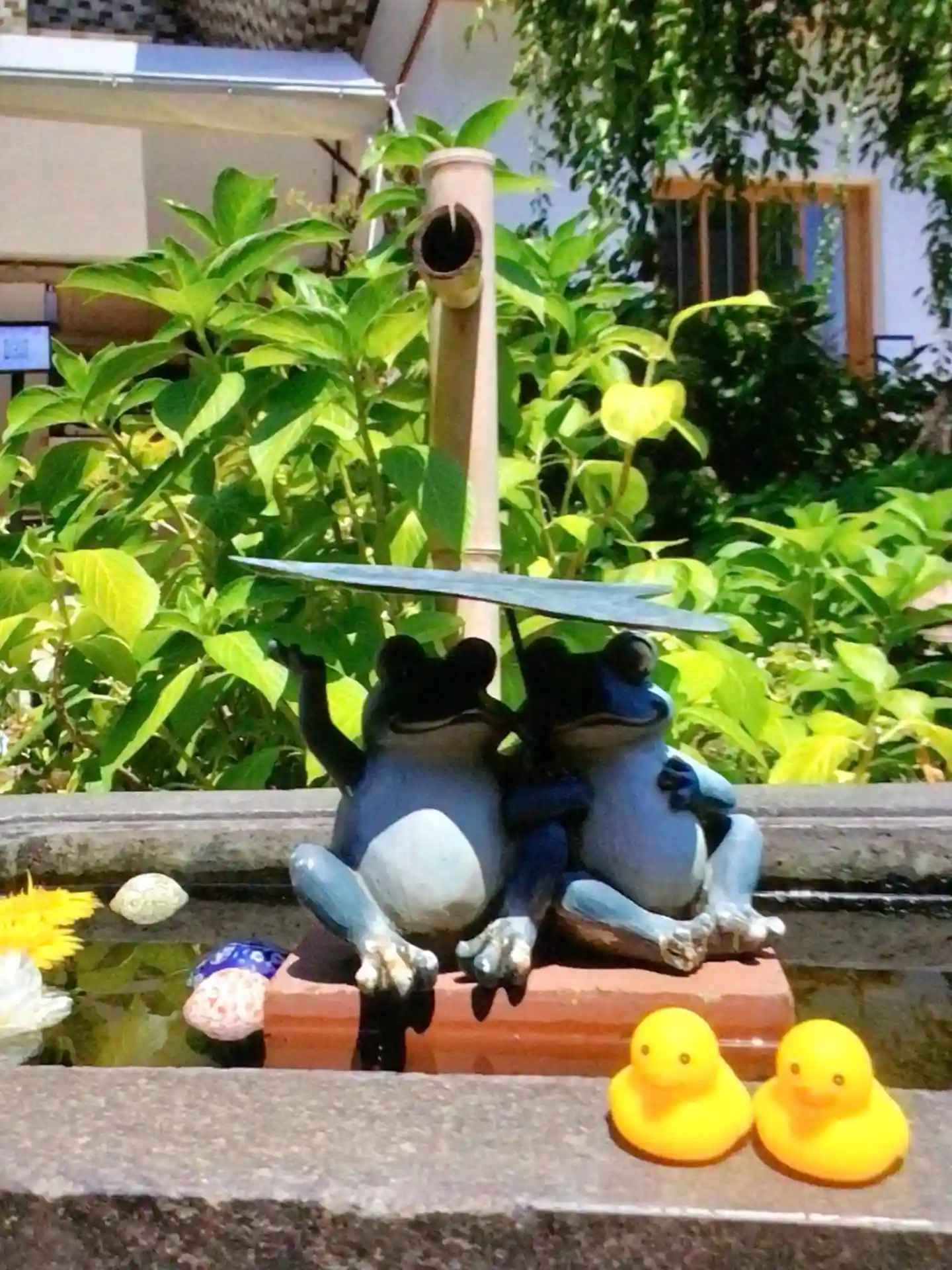 花手水だけでなくご本堂前や境内のあちらこちらに、美しいお花が入れられて有名な法輪寺さんですが、流石にこの酷暑なので、生花はお休み中。造花や可愛い置物などで癒されましたが、手水舎に少し入れられたお花に迎えられて嬉しかったです。
