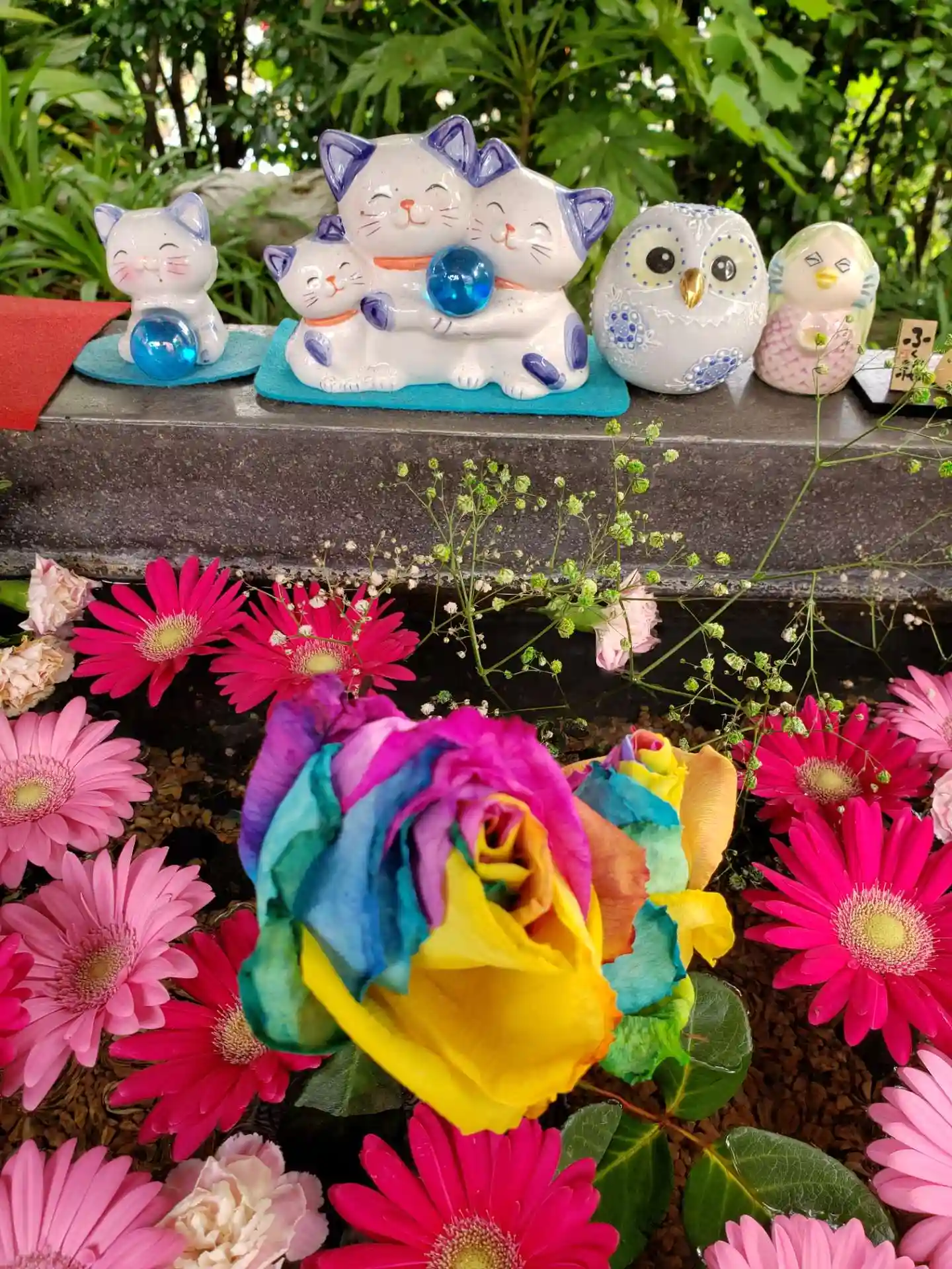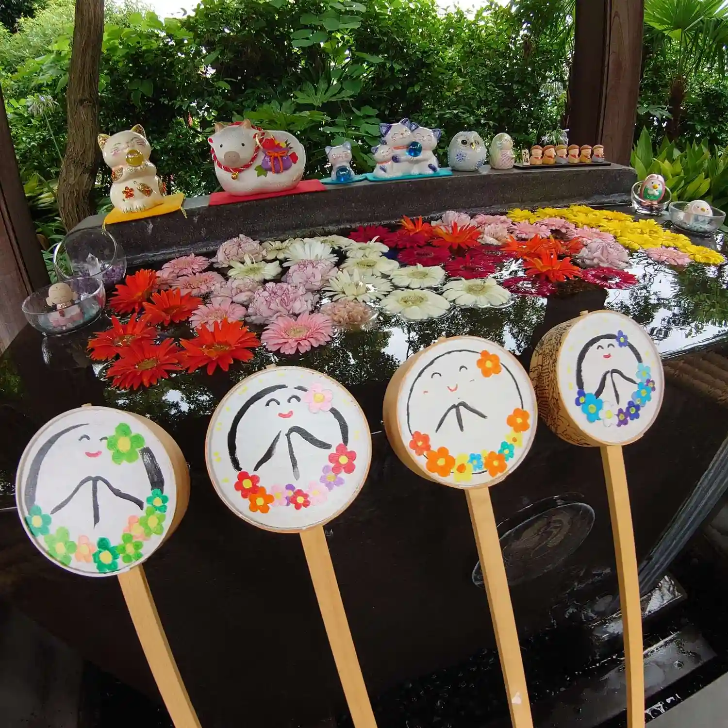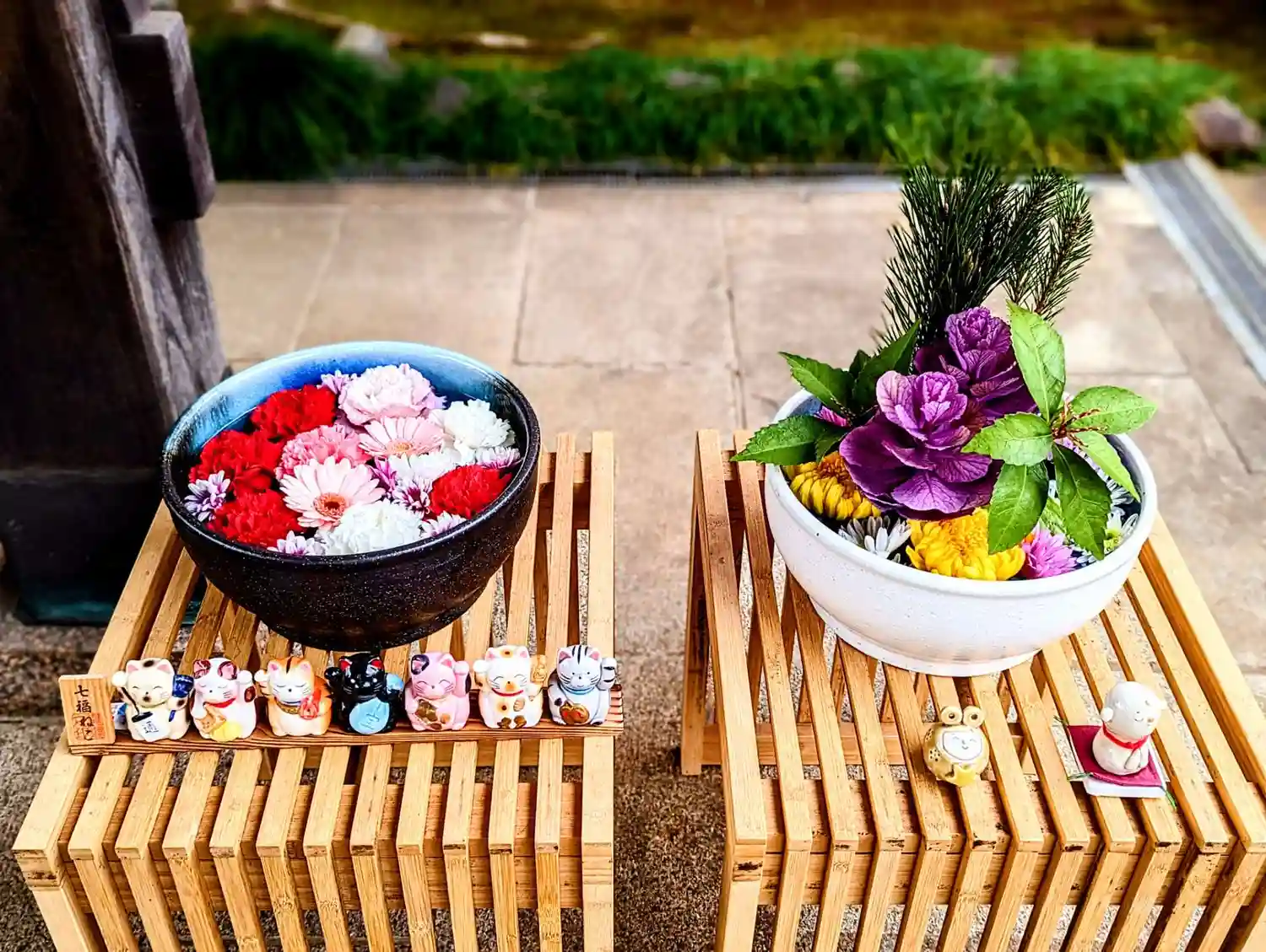 山門の扉の前に飾ってありました😊 お花の手前にあるのは七福猫ちゃん😺 我が家にも同じ物があったけど東日本大震災のときに割れてしまいました😢
