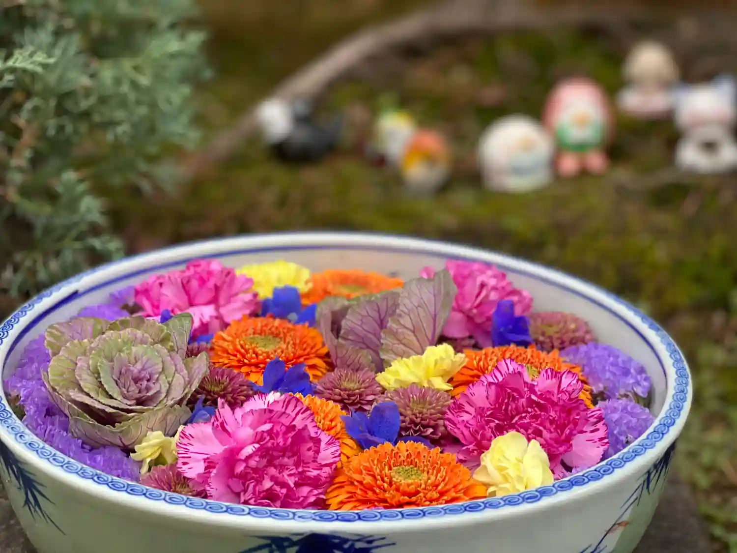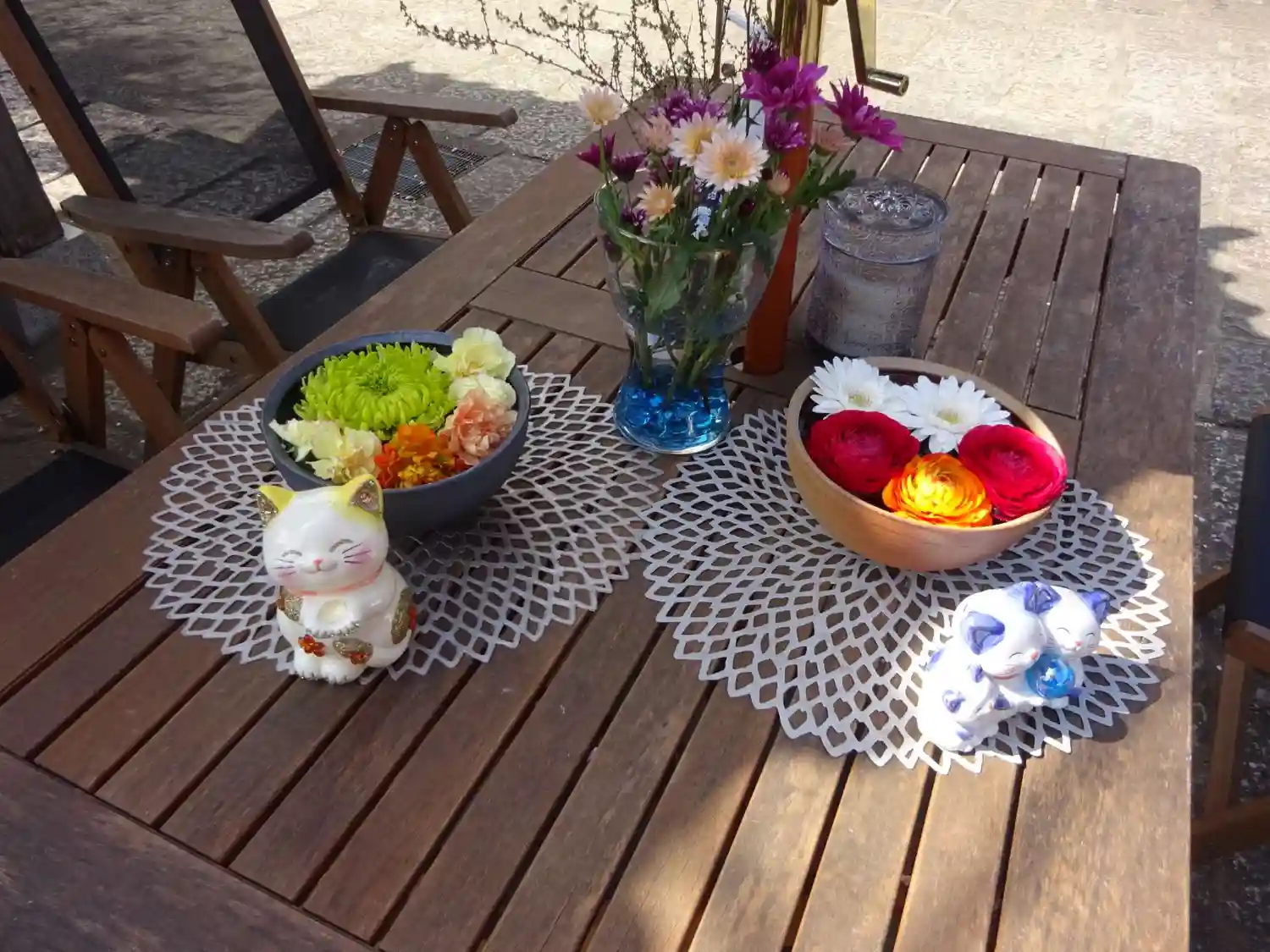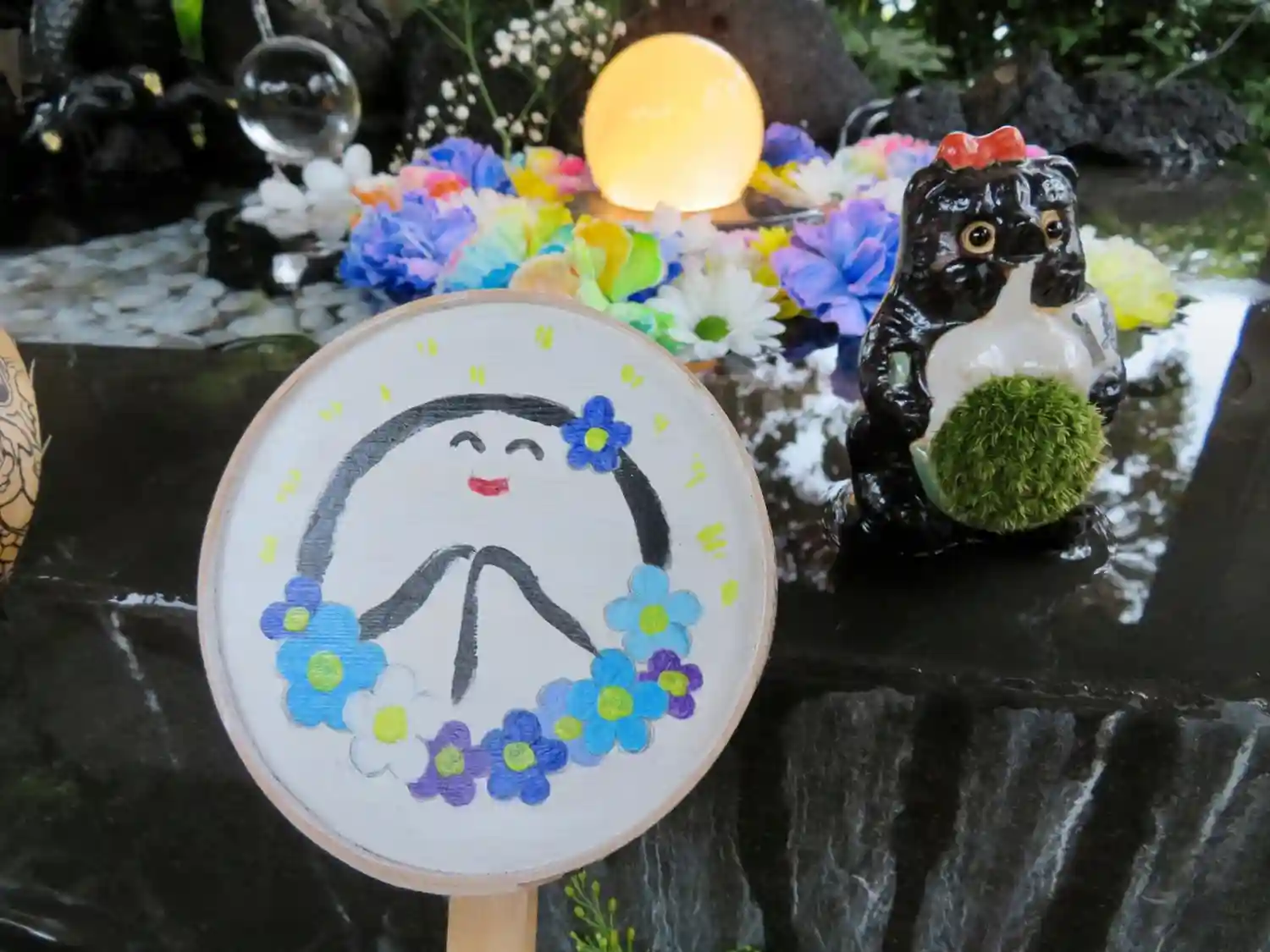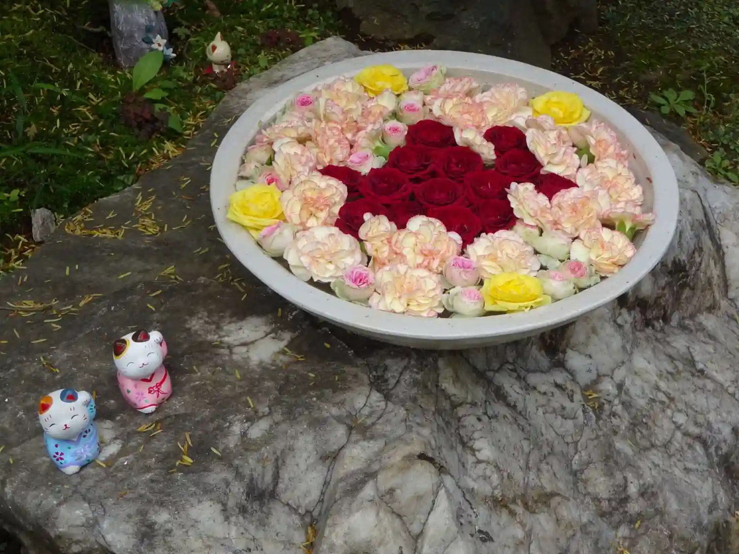 山門の扉の前に飾ってありました😊 お花の手前にあるのは七福猫ちゃん😺 我が家にも同じ物があったけど東日本大震災のときに割れてしまいました😢