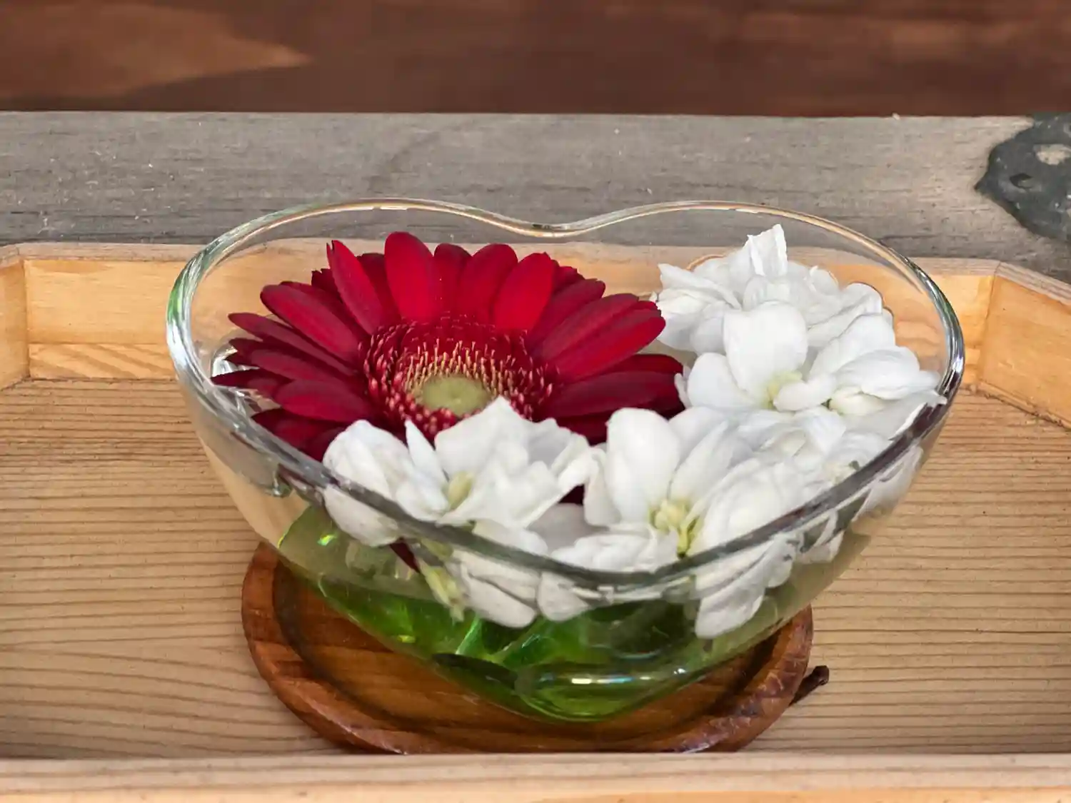 ☆花手水☆ 花手水と、名前がわからないのですが、ふんわり優しい香りのするお花☺️