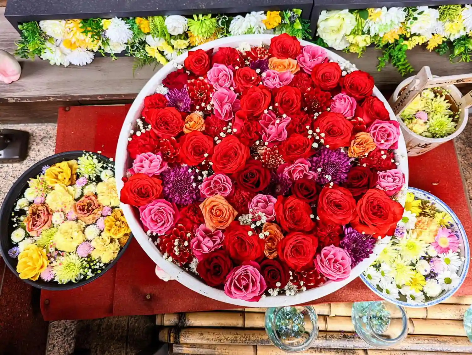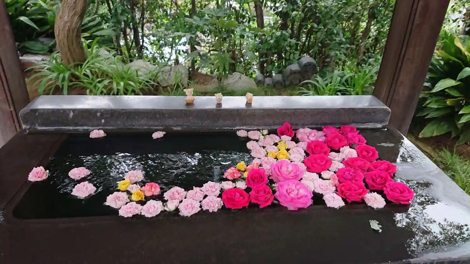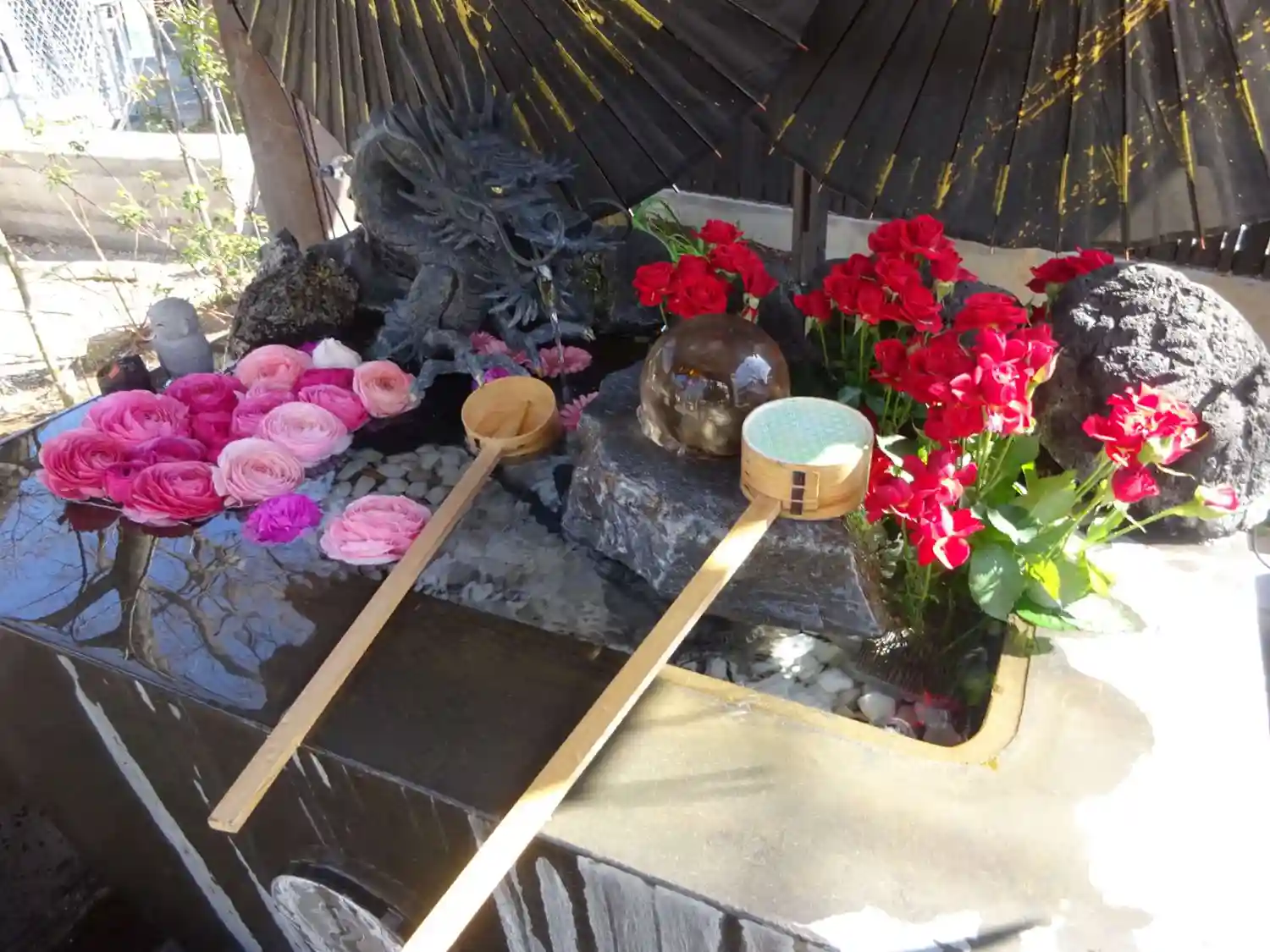 ご住職様が”お風呂花手水“と呼んでいる器には、赤を基調にしたバラ🌹の花が盛り沢山でした😆