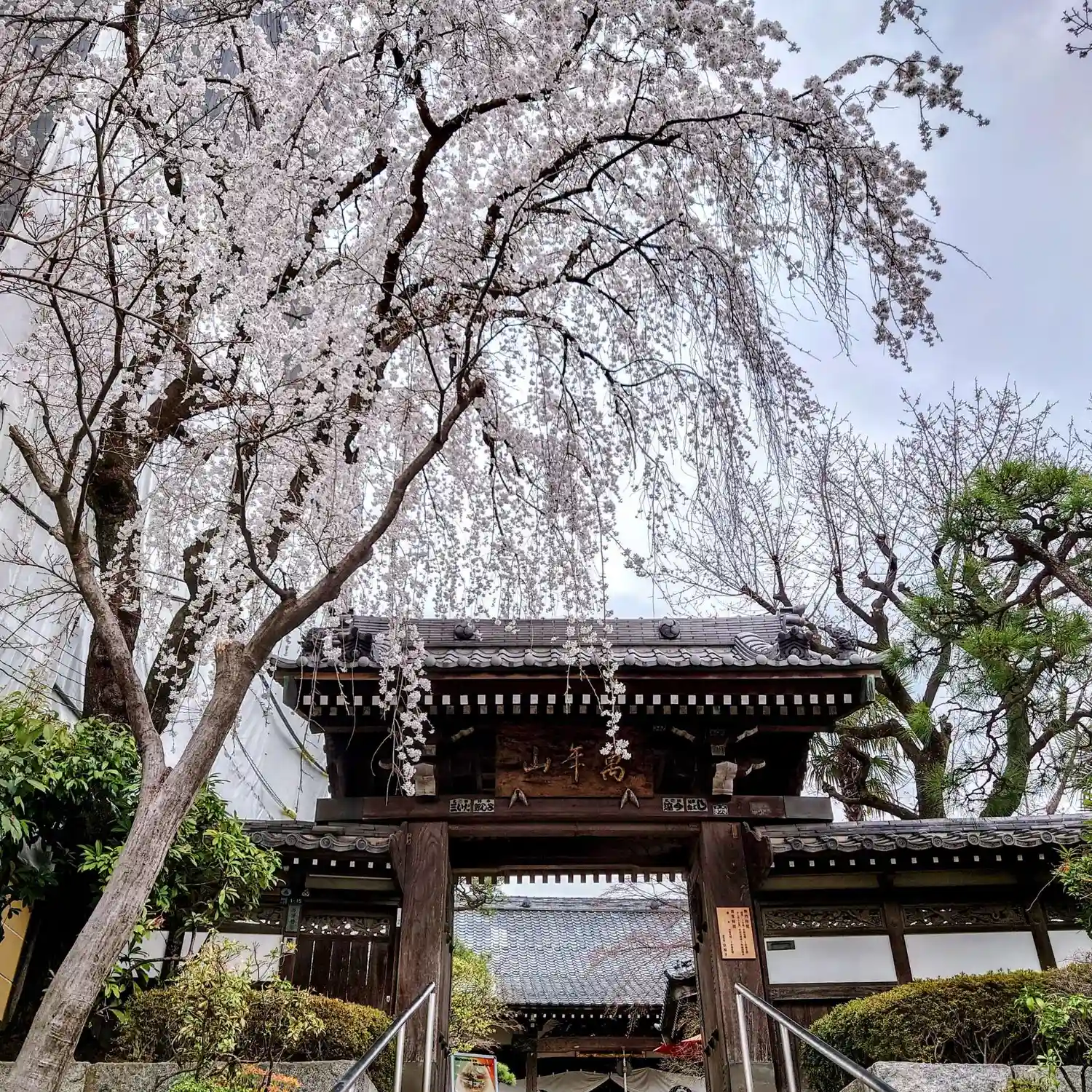 山門の枝垂れ桜がちょうど満開😆🌸 どんよりとした曇り空で、露出に苦労しました😅