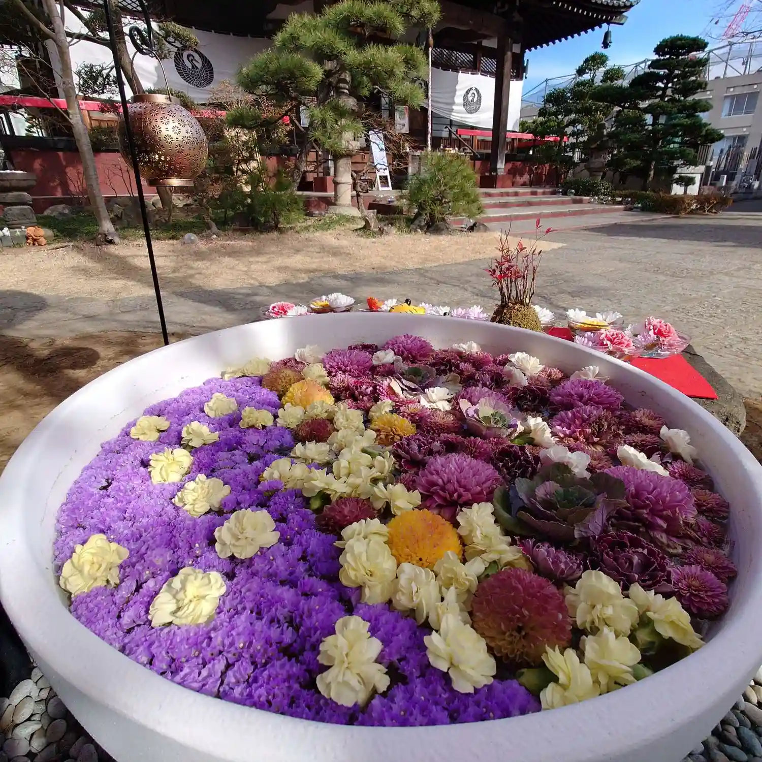 🌼山門の所の花手水🌼 お正月らしい花手水ですね😊