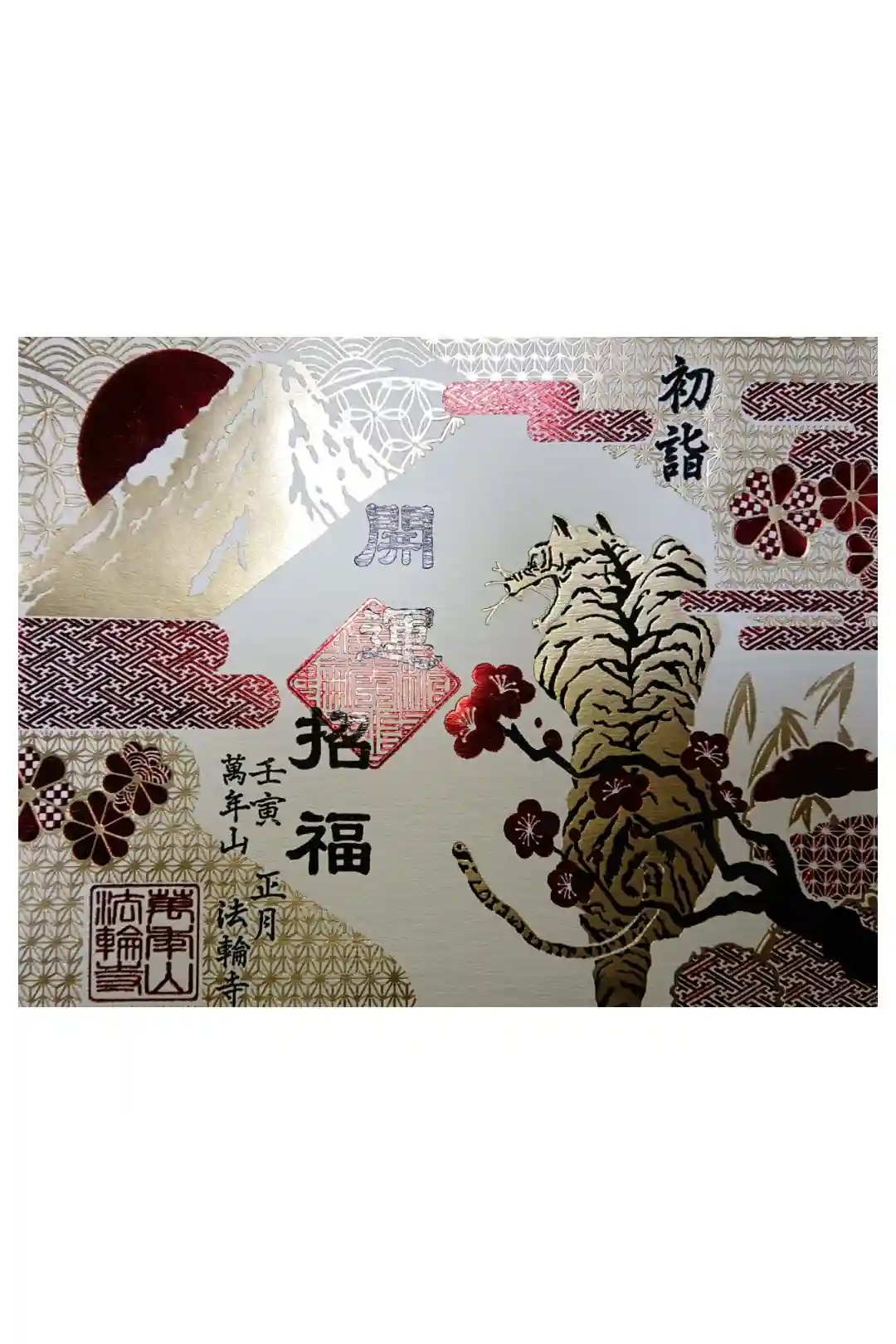 寅年にちなんで虎🐯の登場ですが、富士山、初日の出、梅の花、どれも金ぴか箔押しです✨