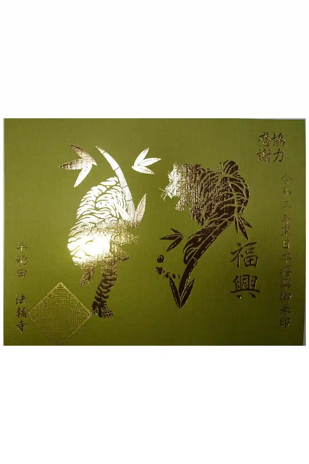 緑地の和紙に金の箔押しの虎が輝いております。