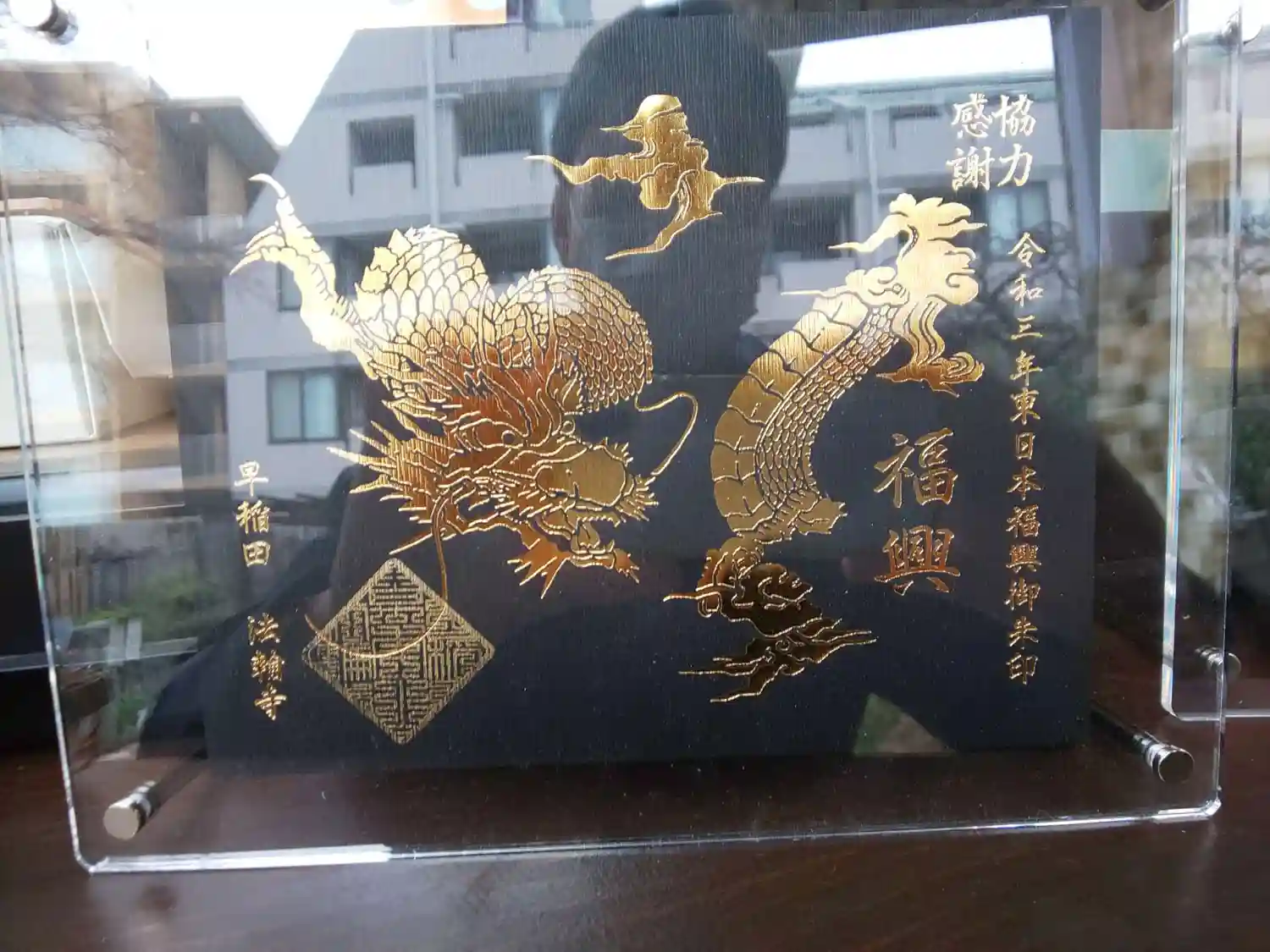 東日本復興支援チャリティ御朱印『金龍』(↑見本)。自分の影が邪魔。