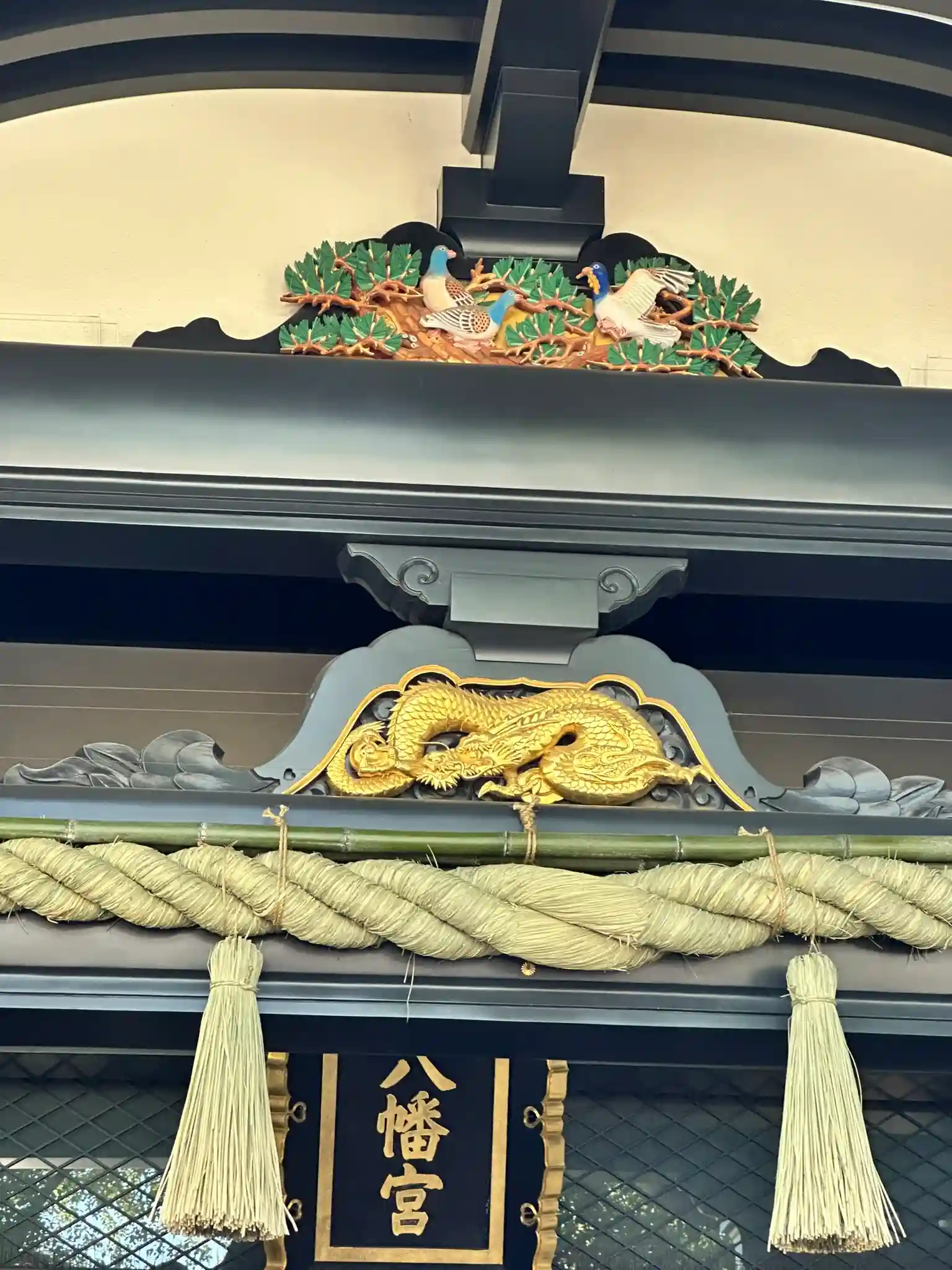 朱塗りが鮮やかな「光啓門(こうけいもん)」は、青空とのコントラストが美しく、威厳を感じます。 手水舎では、柔和な笑顔の布袋様にお会いしました。江戸城ゆかりの像のレプリカだそうで、そのふくよかなお腹を見ているだけで福をいただけそうです。 社殿を見上げれば、八幡様の使いである鳩や、精巧な黄金の龍の彫刻が施されており、その美しさにしばし見惚れてしまいました。