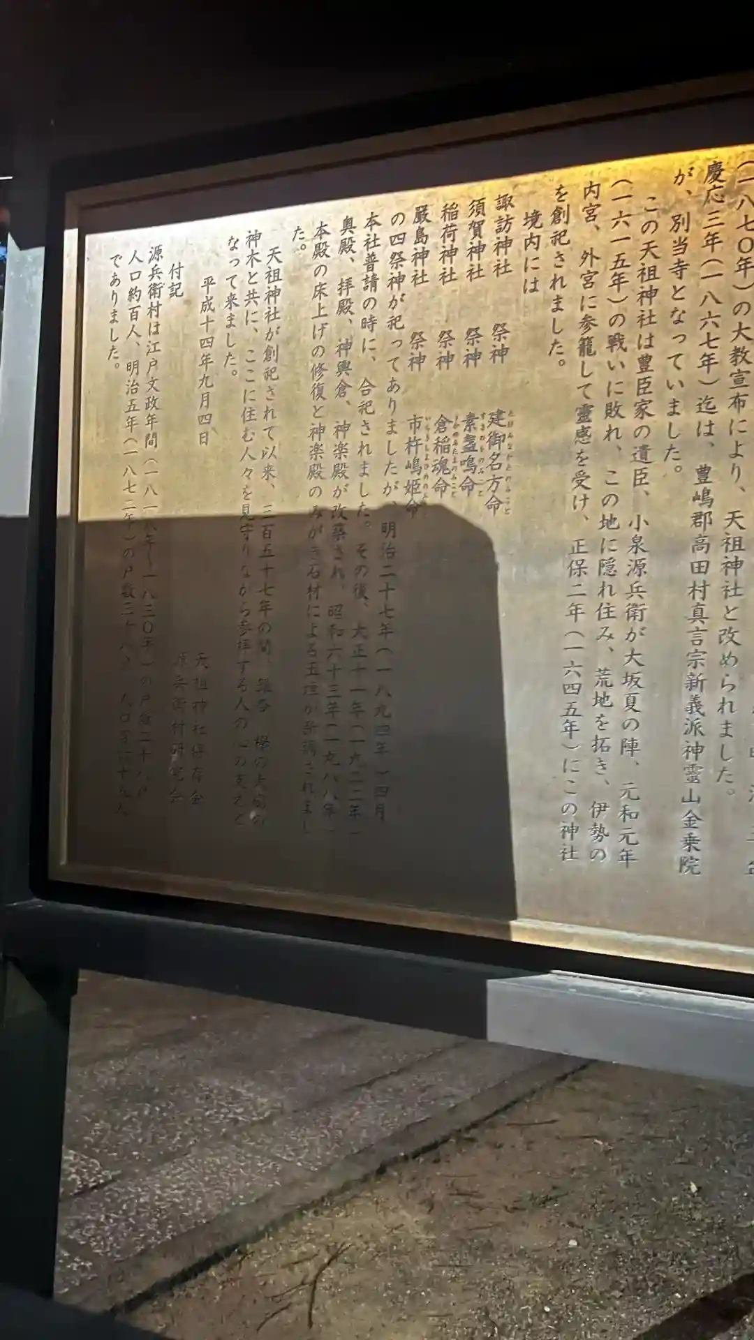 由緒書きを拝見すると、こちらの御祭神が日本神話の中心的な神である天照大神であることが記されています。創建は正保二年(1645年)と伝えられ、豊臣家の遺臣である小泉源兵衛が荒地を開拓し、この地に天祖神社を建立したとのこと、地域の人々は天照大神のご加護を仰ぎ、安心して暮らせるよう安全と繁栄を祈願するために参拝を続けてきたのでしょう(近くの早稲田通りに「源兵衛」という屋号の飲み屋があったのを思い出した)。また、創建以来の歴史の歩みや社殿の改修など、地域文化の重要な一部としての役割を果たしていることが伝わってきます。歴史の重みを感じながら参拝することで、より深い敬意と感謝の念が自然と湧き上がってくる、そんな場所です。