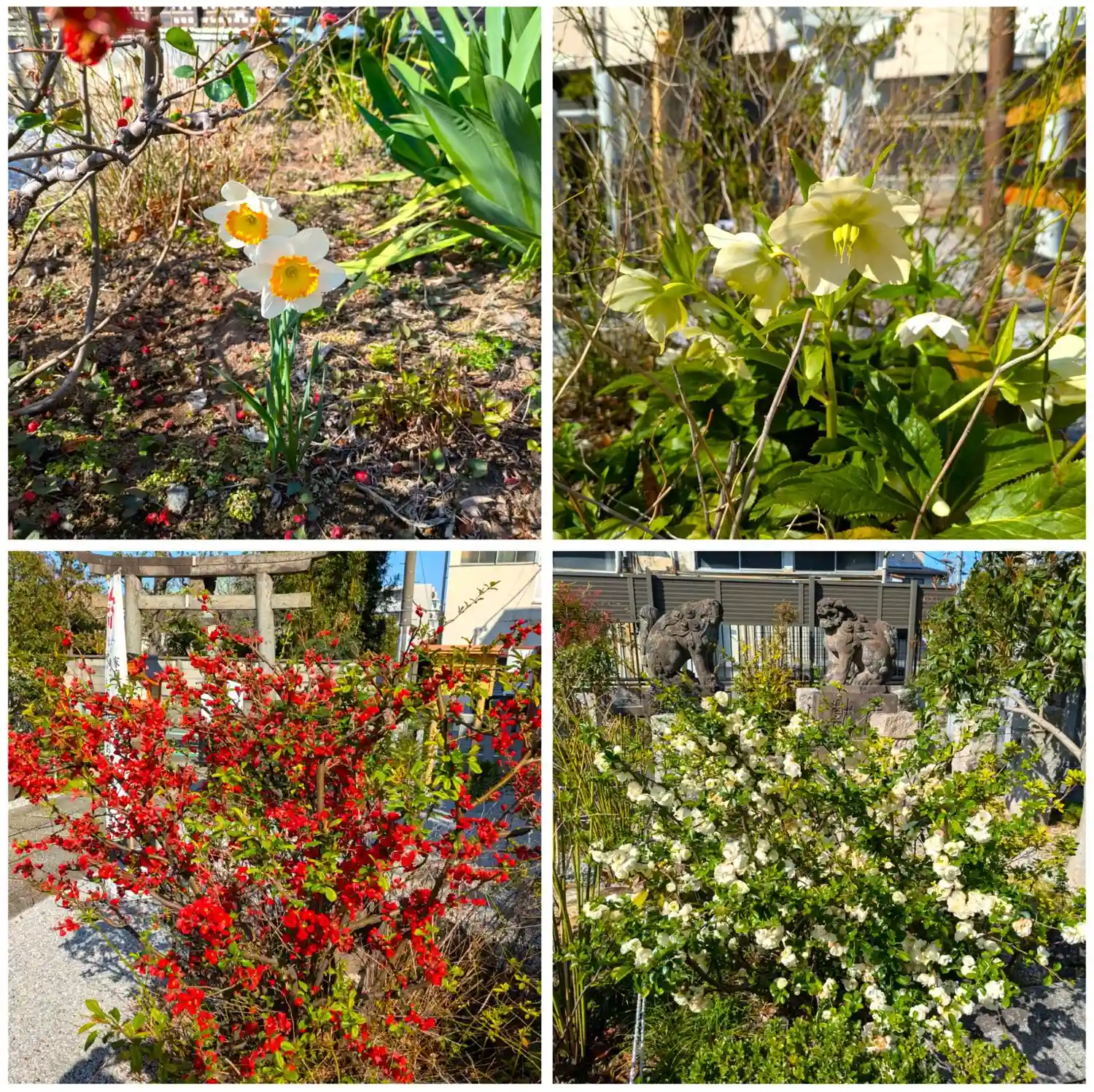 水仙、クリスマスローズ、木瓜。白い木瓜の後ろには石造りの古い狛犬も。