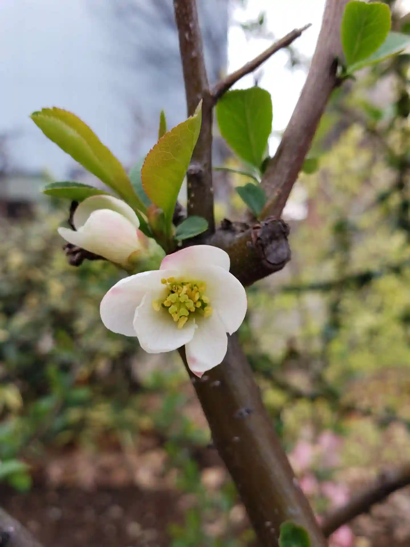 梅が終わり、境内には木瓜が少し。撫で牛も撫でられないまま、一年近くです。