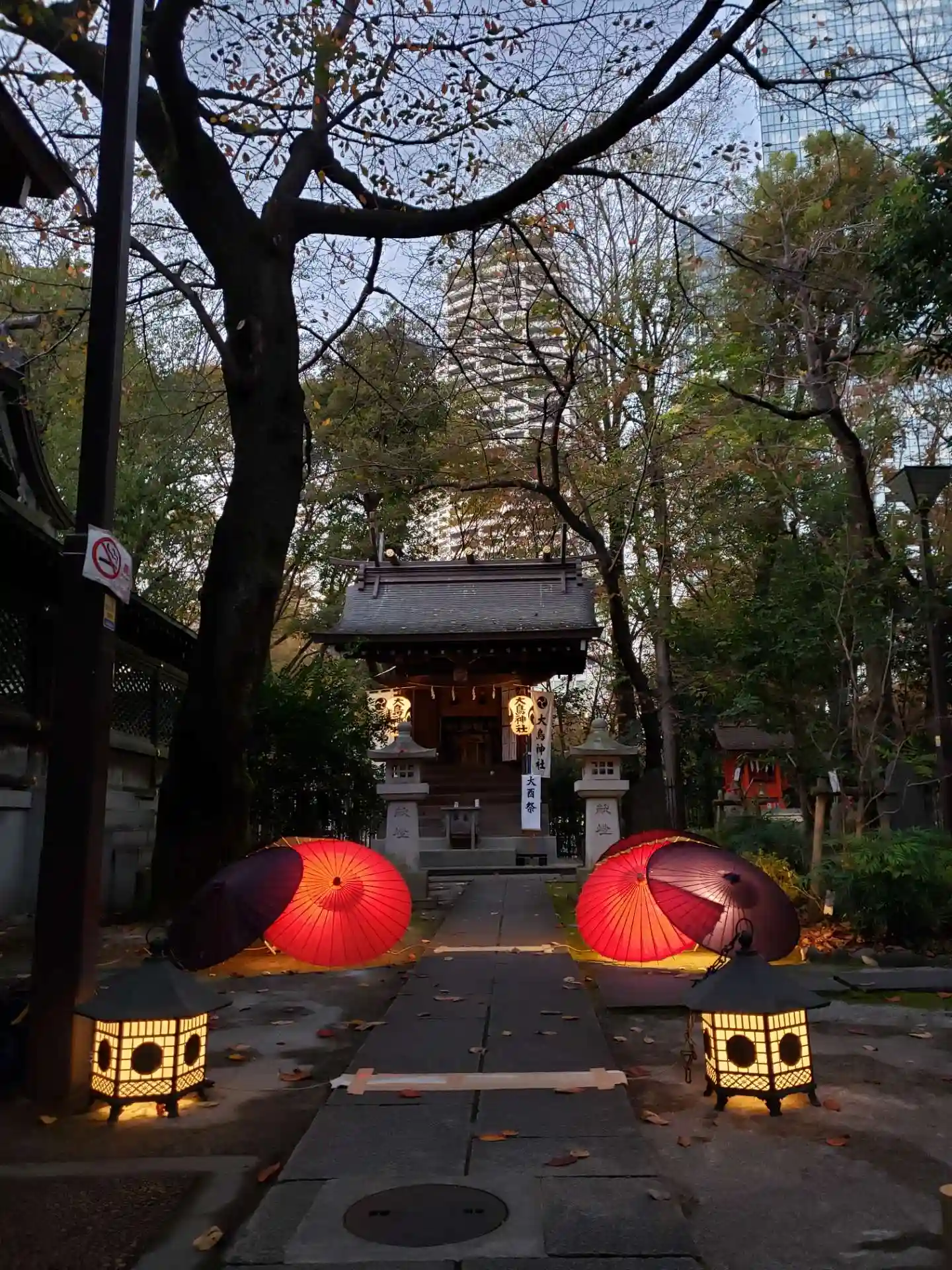 本殿右奥、大鳥神社の大酉祭で、素敵にライトアップされていました。
