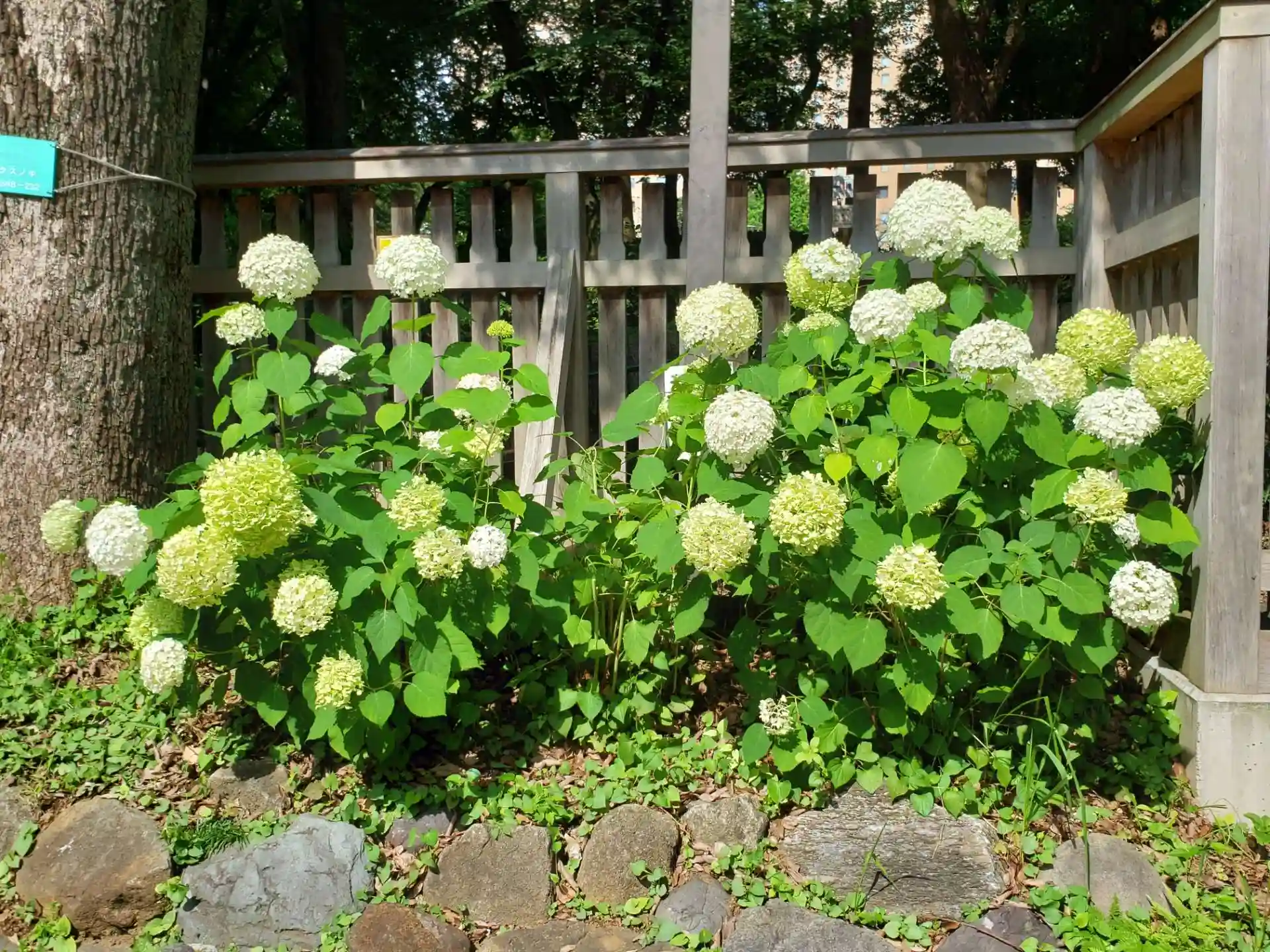 地元の神社です。いつものようにお参りに伺ったところ、白い大輪の紫陽花の花手水でした。少し影になる場所と造りの手水舎に、少しだけ緑も垣間見れる白メインで素敵。これは確か、昨日?一昨日?見た右手の中央公園への出入り口近くにある白い紫陽花が、満開だった…とそちらを見ると、納得の花数(^.^)