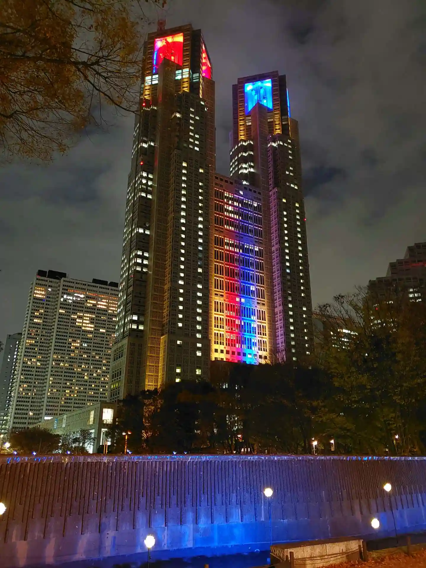 背景に先端のツインタワーのみ写っている都庁は、今は『いい夫婦の日(11/22ですが、前後数日もこのライトアップ中)』のライトアップしている物なので、最後にオマケに隣接している新宿中央公園からの都庁の全景写真も!