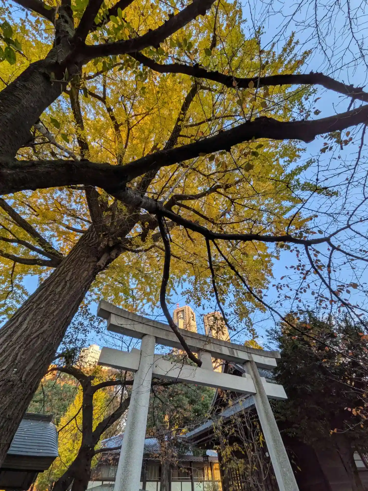 鳥居の向こうには新宿パークタワーの三連ビル