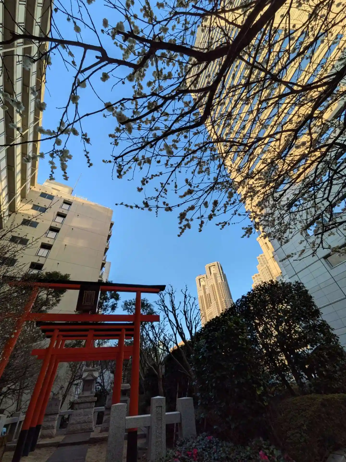 高層ビルの谷間にある、小さな綺麗な神…