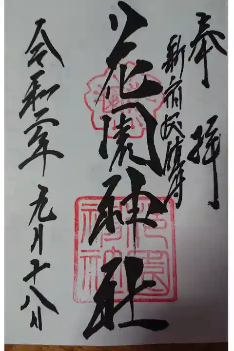 若い頃何回か参拝したことがありますが、久しぶりの参拝。正式には花園稲荷神社であることを初めて知りました。立派な社殿で流石の花園神社で参拝する方もこの時期にしては多いのかも。拝殿には3つの神額があり、3柱が祀られている。表の狛犬は非常に立派だが、裏の狛犬は痩せている。古そうだが文字は判読出来なかった。直書きで素晴らしい御朱印を戴きました。
