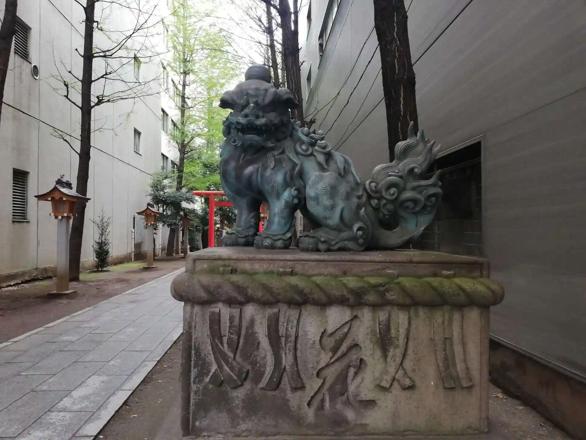 靖国通りから鳥居をくぐりすぐに鎮座している唐獅子。