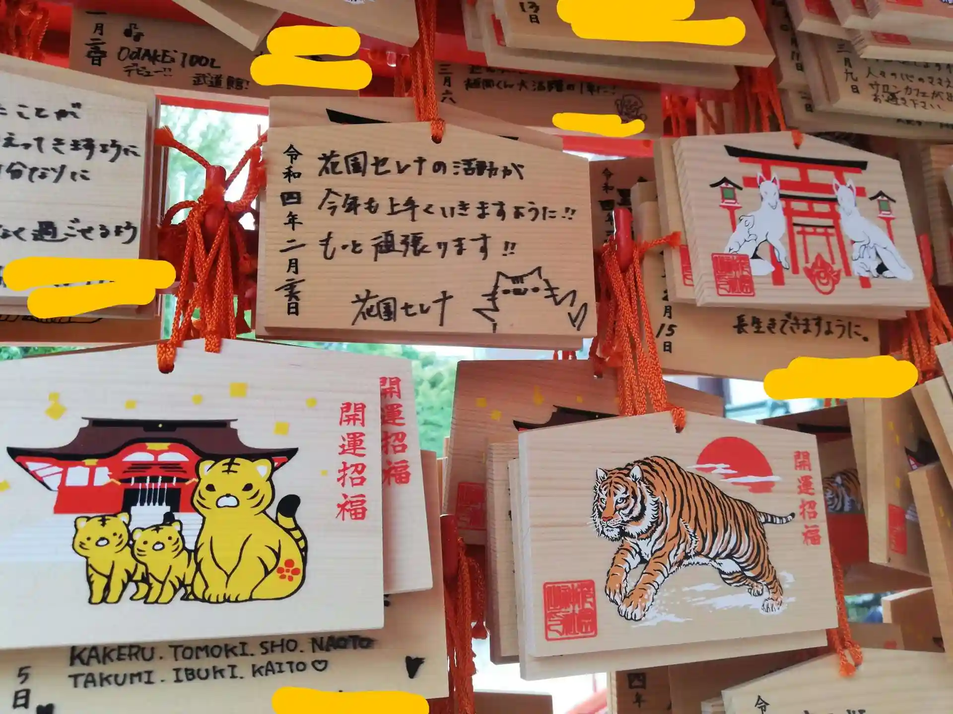 寅年の絵馬2種類、お稲荷さんの絵馬に囲まれていたVTuber花園セレナさんの絵馬。書いたのは誰でしょうね?というツッコミはなしで。