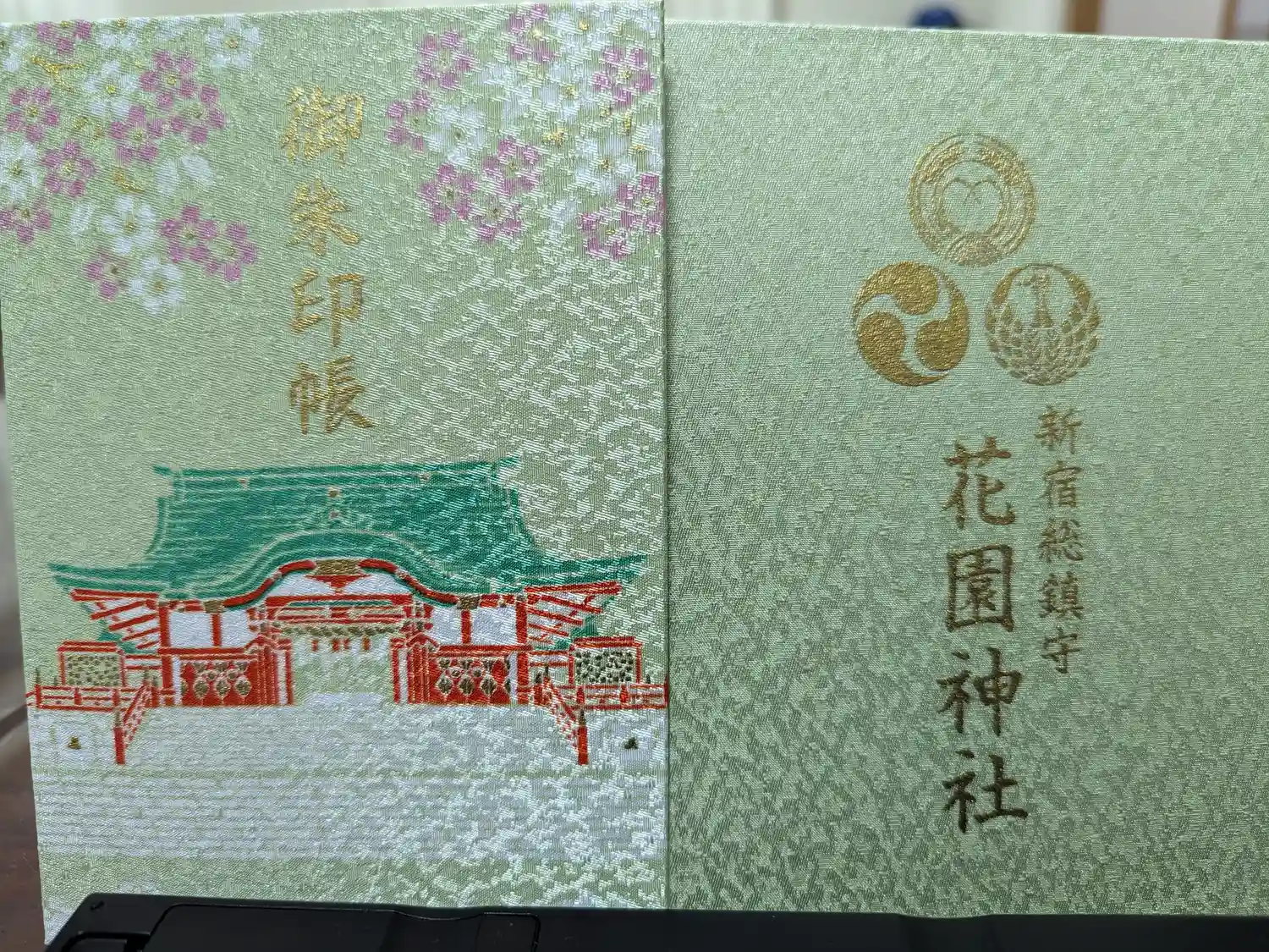 初めての御朱印帳。鶯色にピンクと白のお花がとても可愛いです。