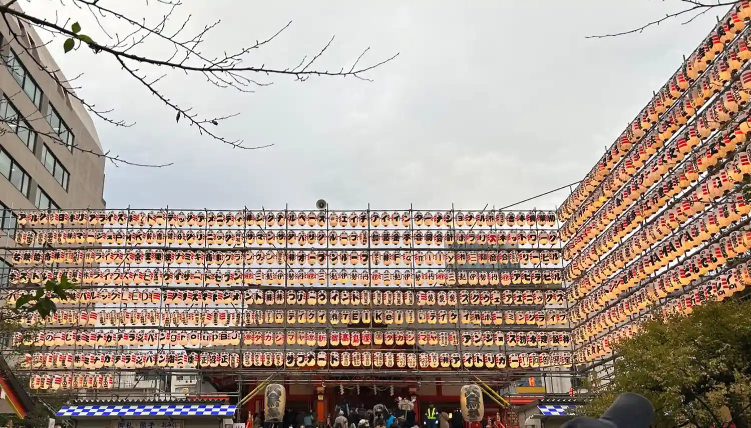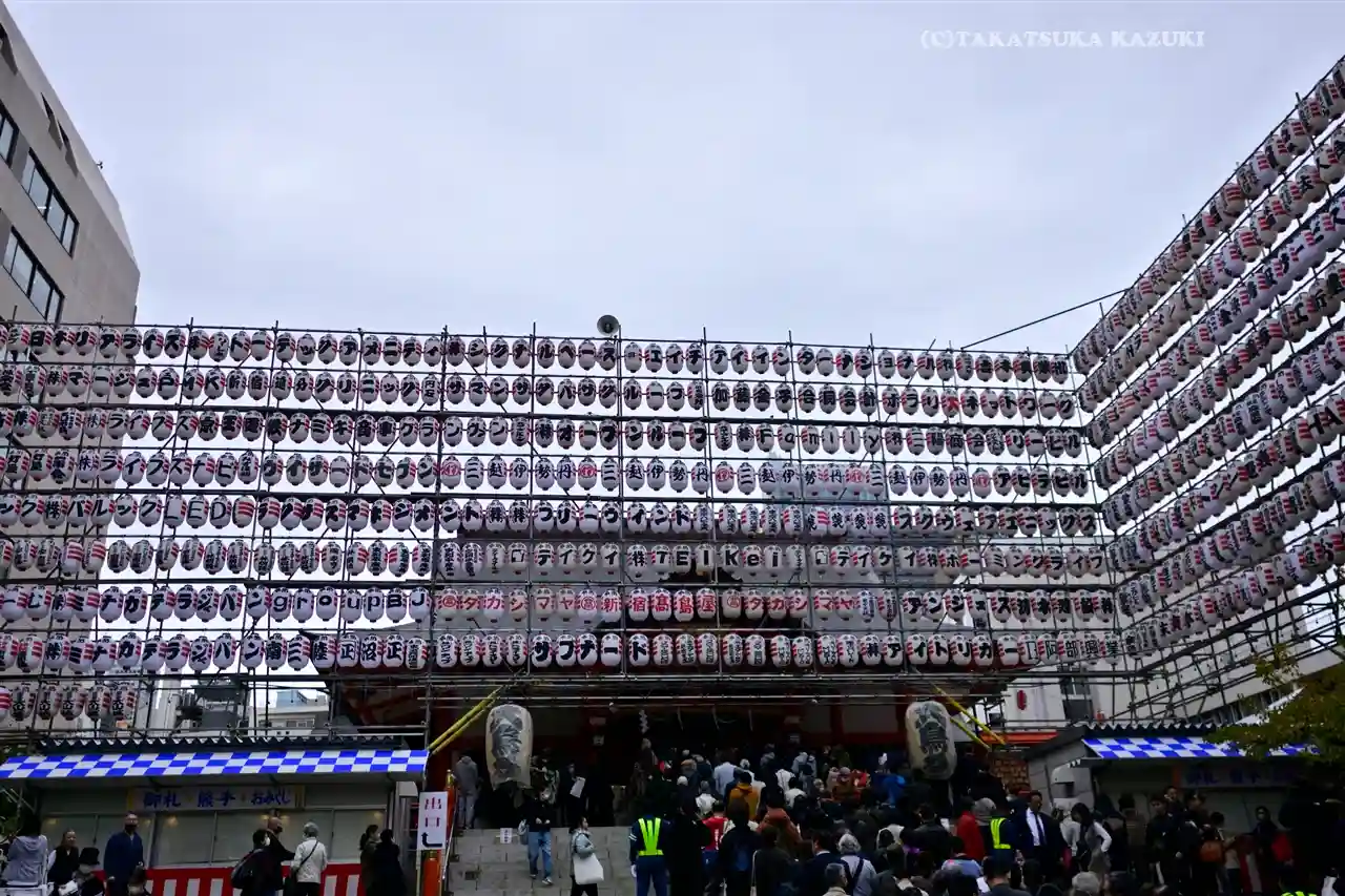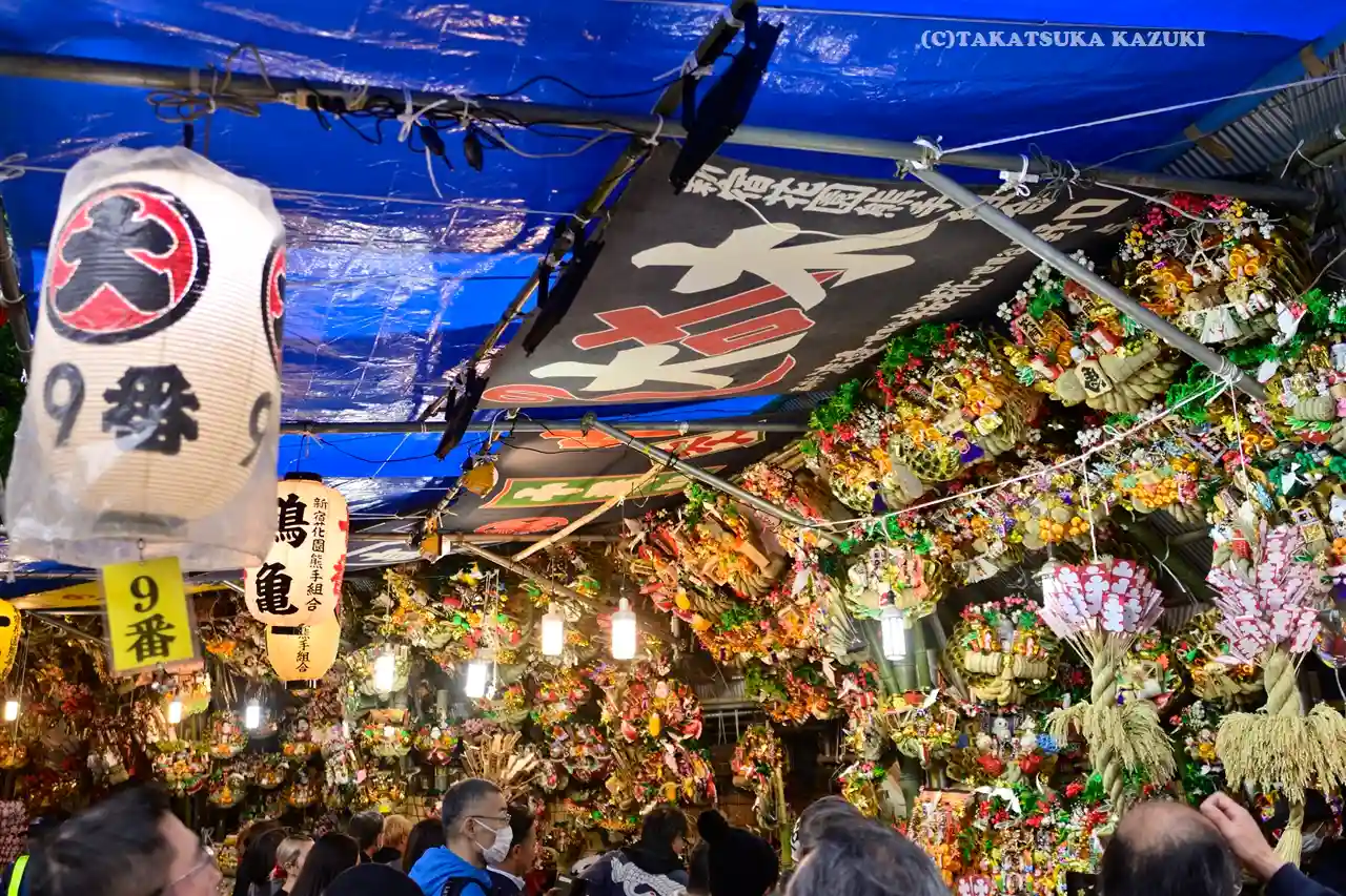 骨董市と、酉の市の準備で賑わう境内。