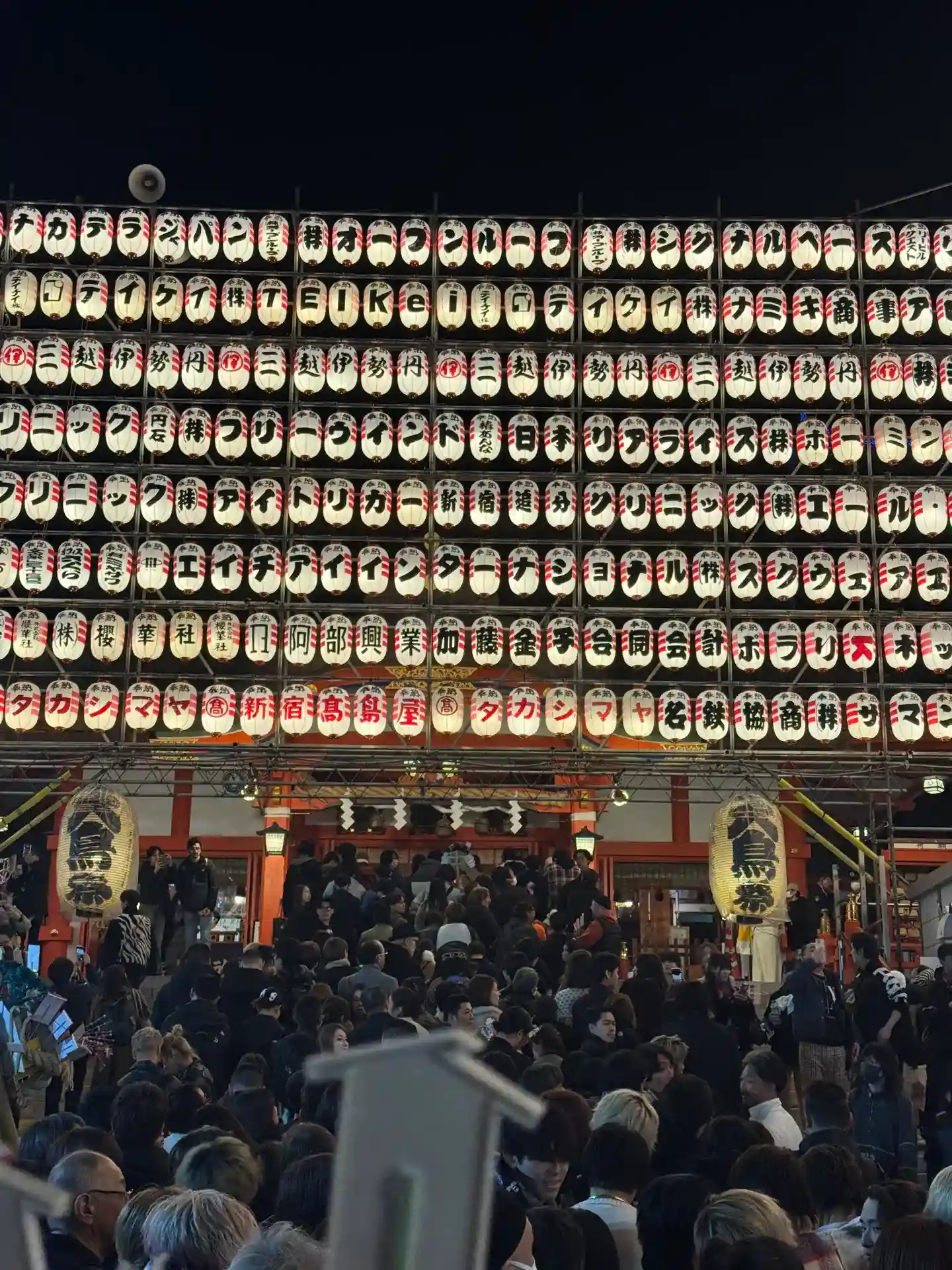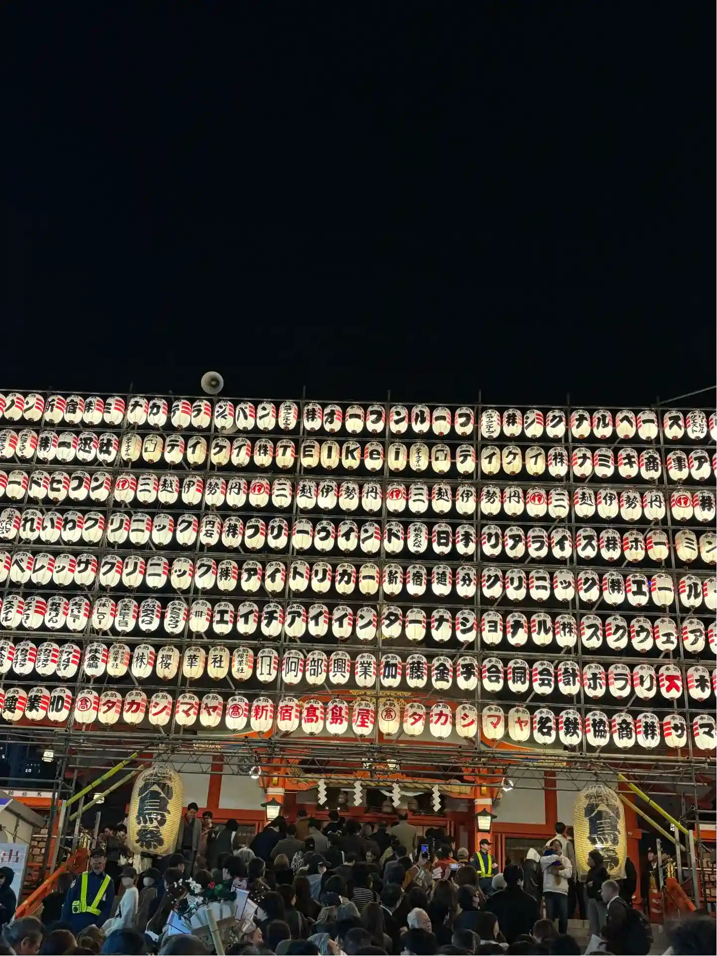 一の酉の前夜祭、花園神社。予想以上の混雑ぶりでした。鳥居をくぐった瞬間から人の波。屋台の灯りと威勢…