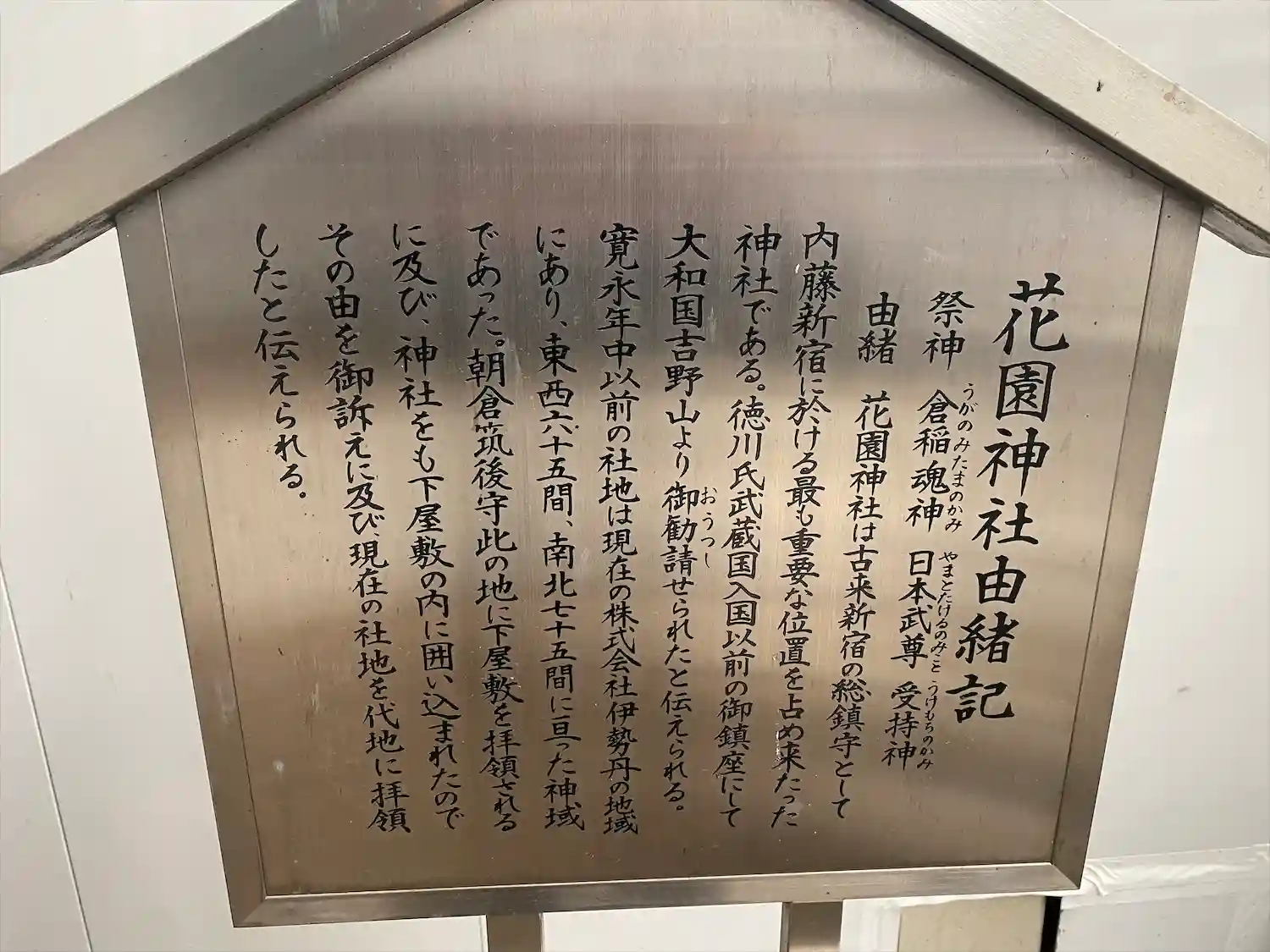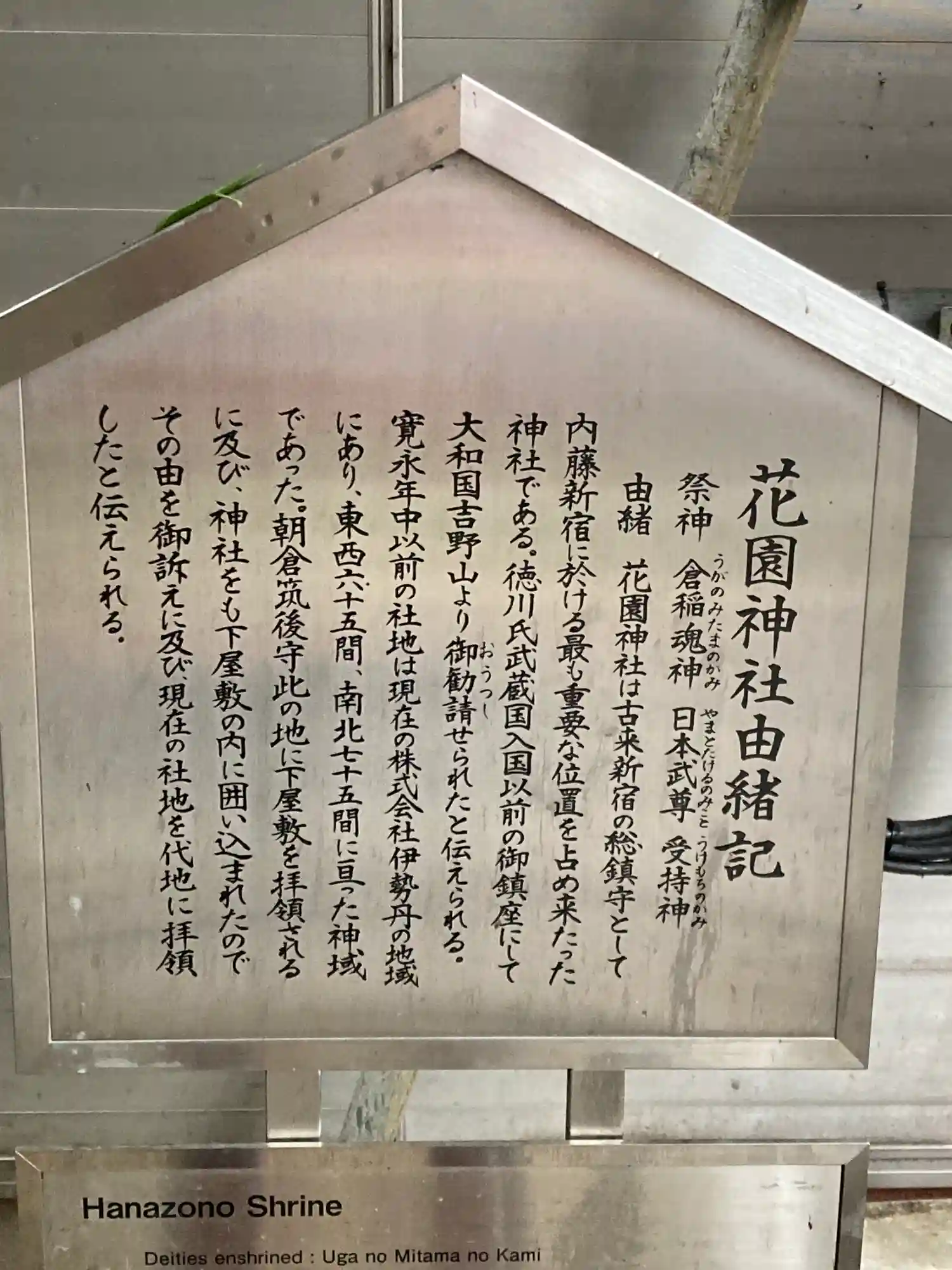 御祭神:倉稲魂神(うかのみたまのかみ)、日本武尊(やまとたけるのみこと)、受持神(うけもちのかみ)…