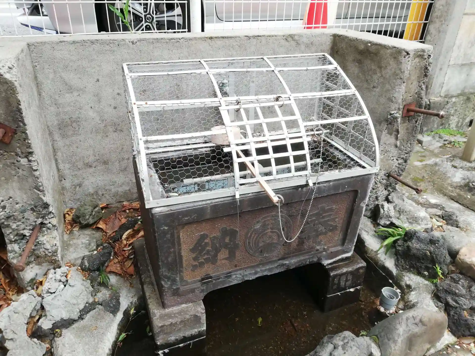 手水舎。金網で囲ってあります。