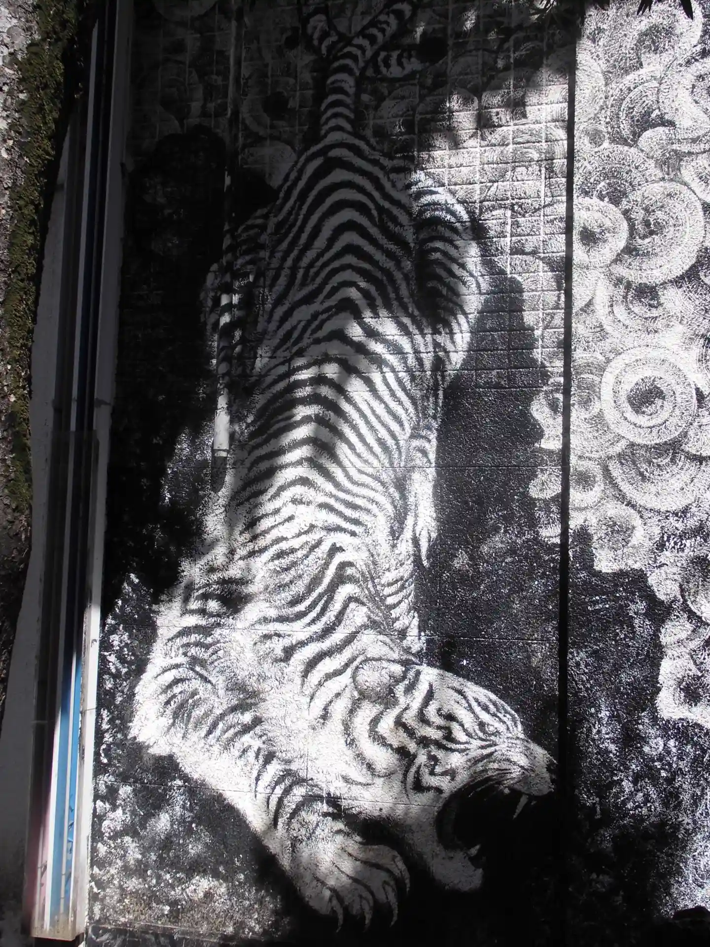 龍虎の壁画は白黒ペンキのみで表現され、水墨画のようです。