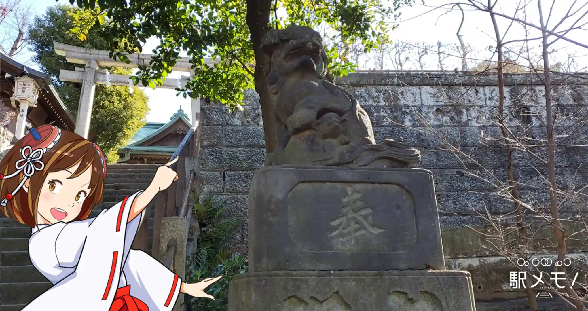 鳥居後ろに狛犬がおります