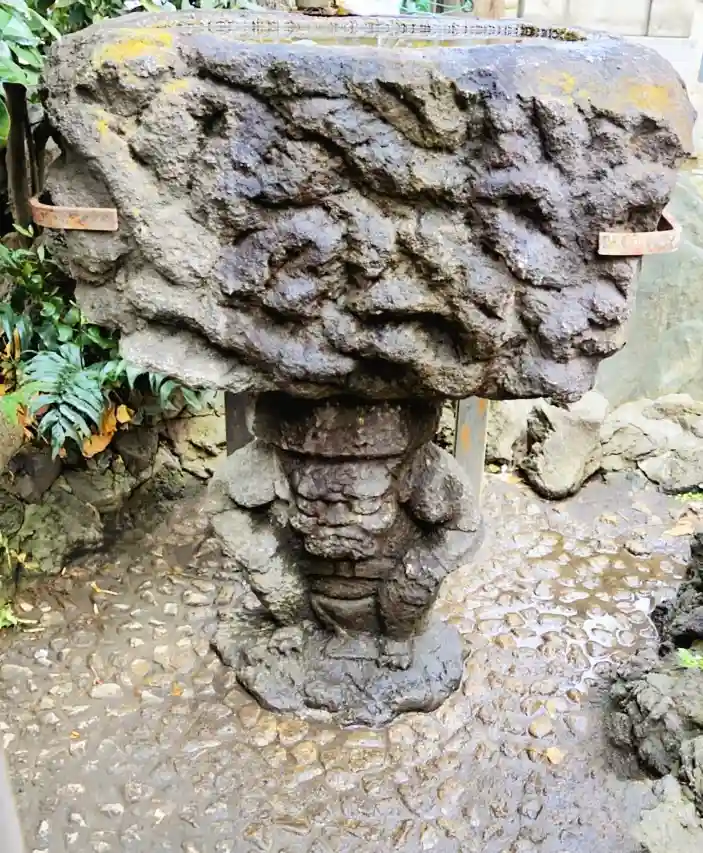 怪しげな水音の正体は、この手水鉢の土台になっている鬼の仕業であるとされ、肩のあたりに斬りつけられた僅かな傷跡が残っている。