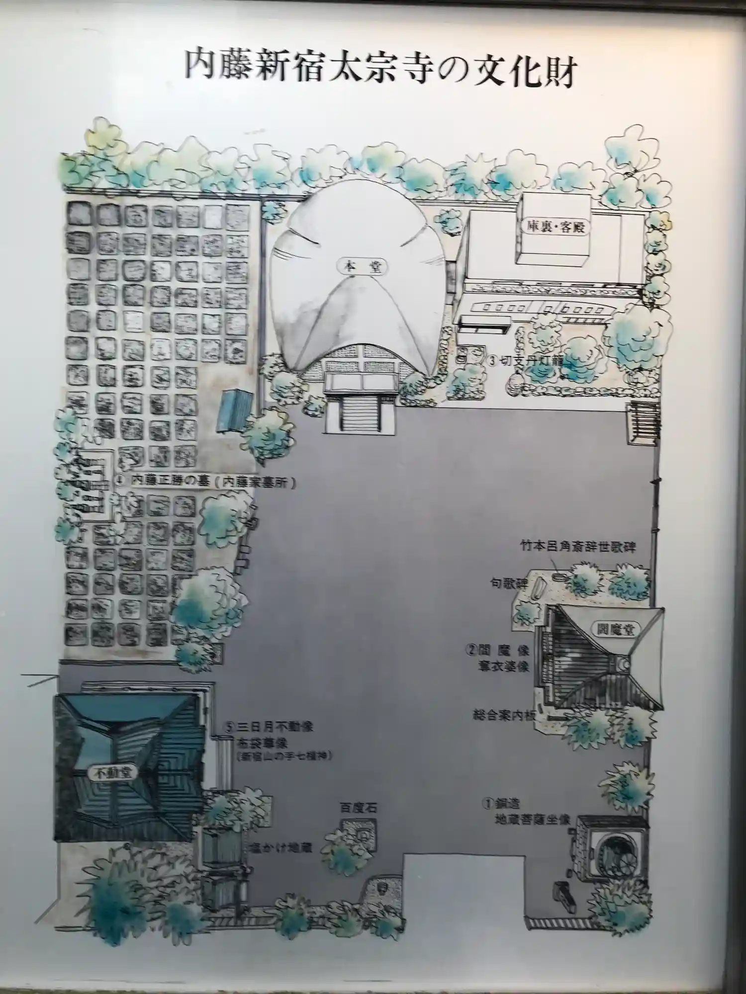 広い境内に江戸六地蔵の銅造地蔵菩薩坐像、新宿山…