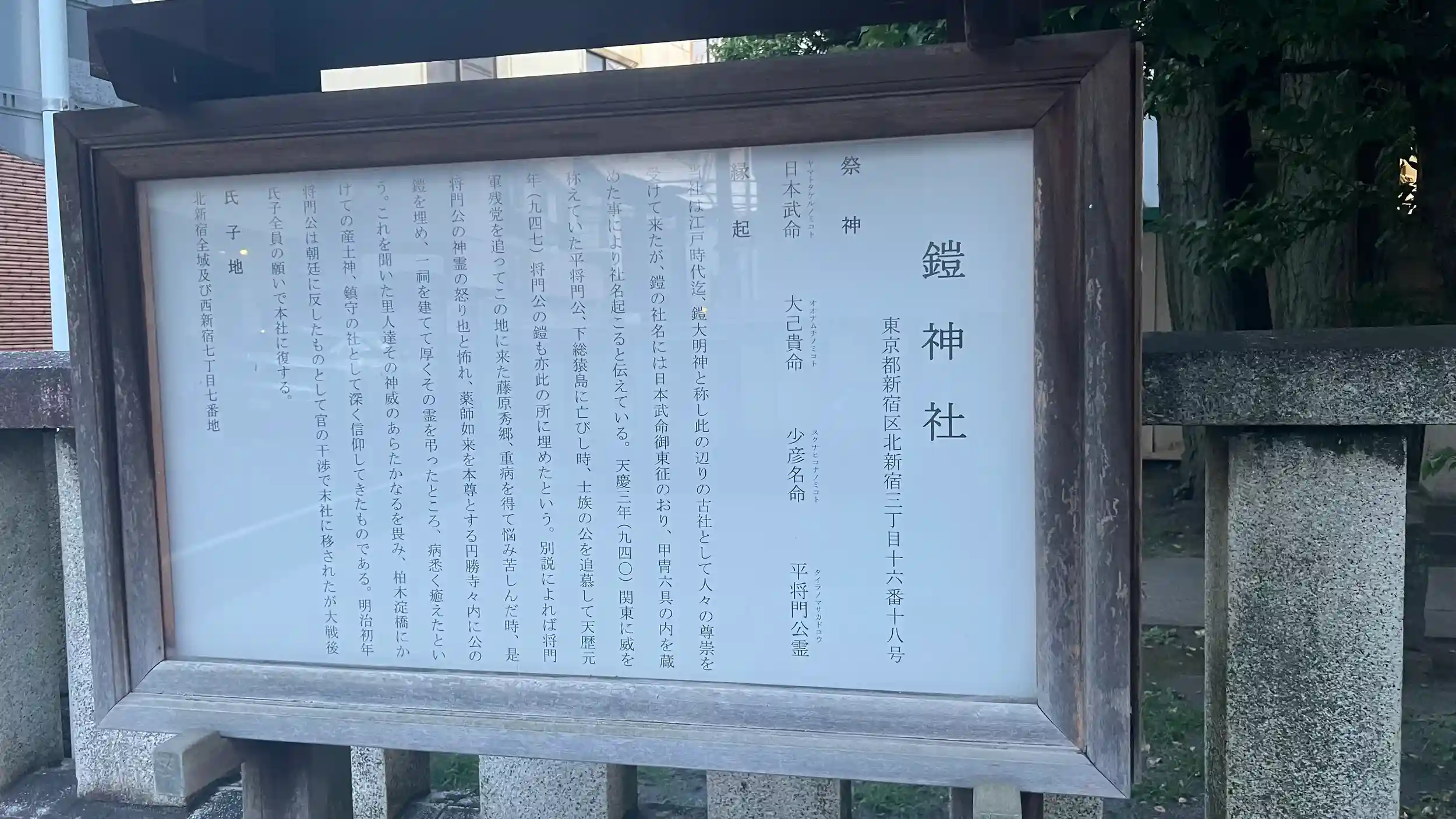 社号の「鎧神社」には多くの伝承が残されている。平将門にちなむとも言われるが、ここでは個別の説には触れず、御祭神を挙げておくにとどめたい。祀られているのは、日本武命・大己貴命・少彦名命、そして平将門公の四柱である。