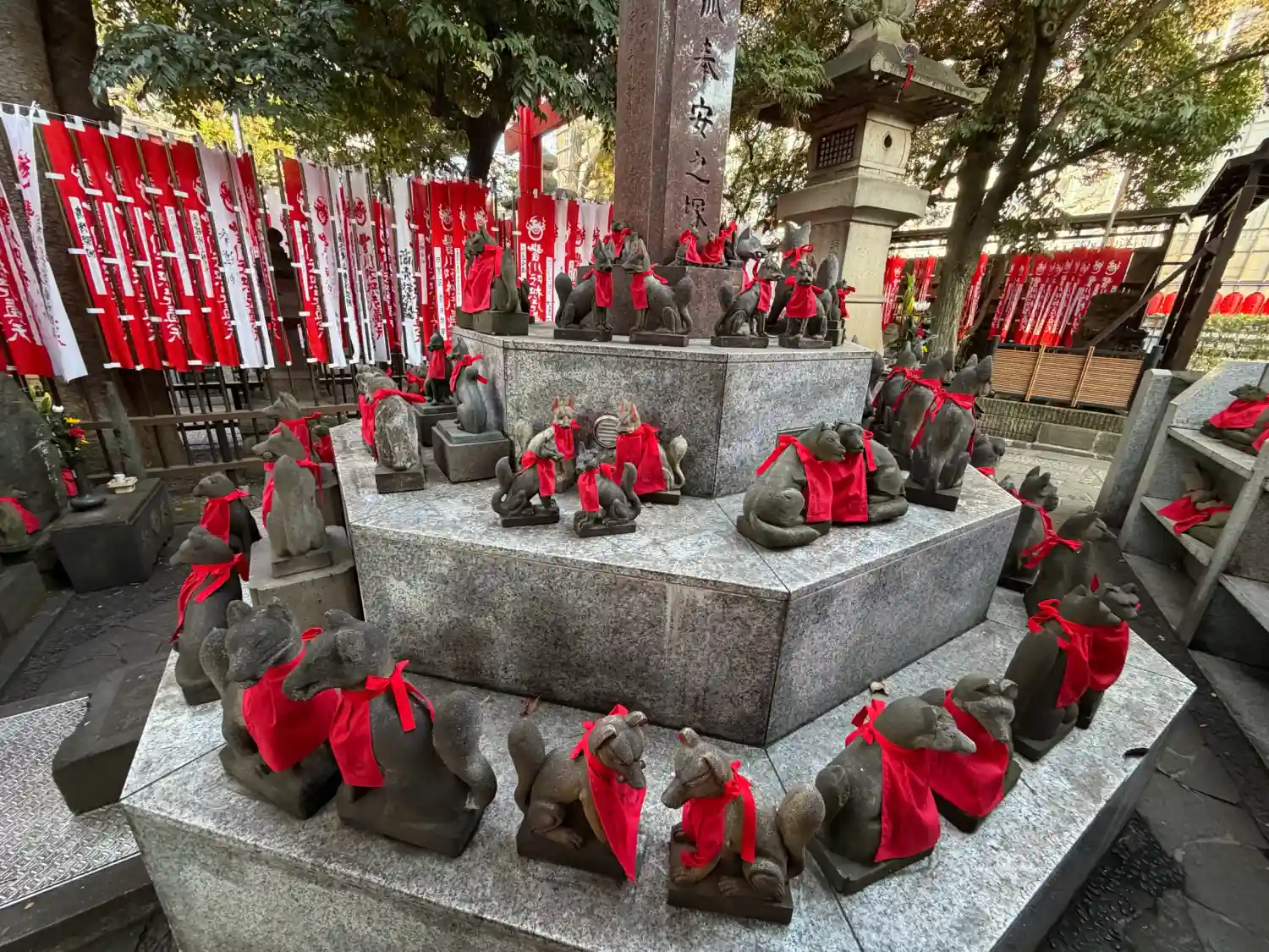 お地蔵さんや狛狐に着けられた赤い前掛けは赤ちゃんのよだれ掛け。