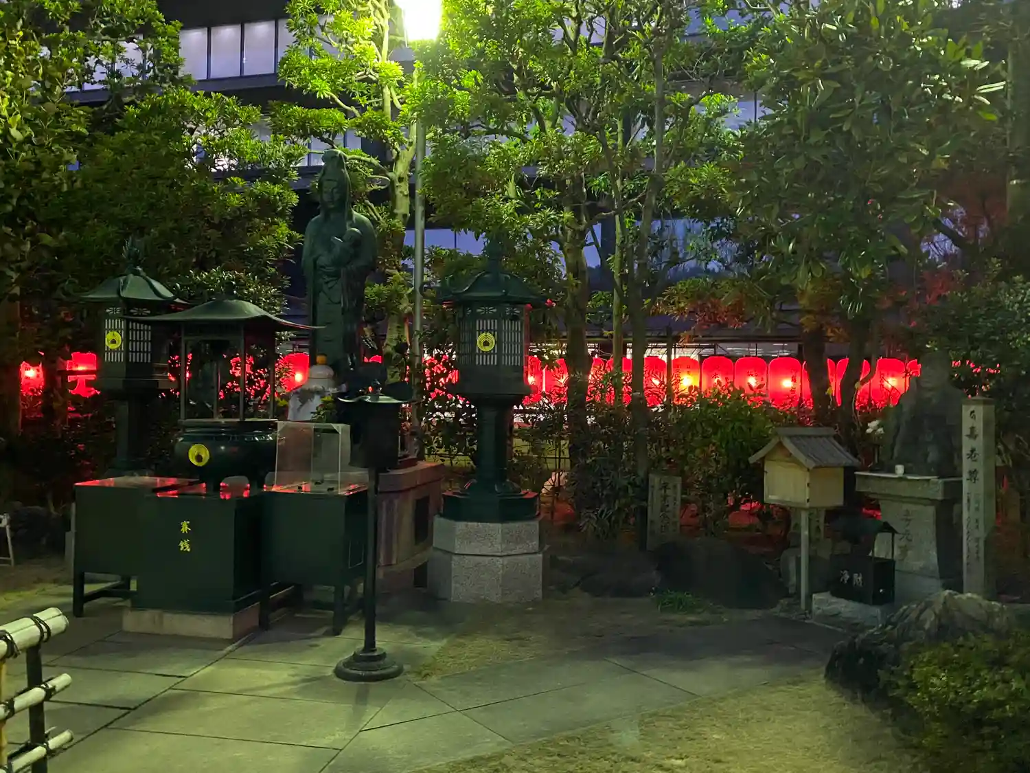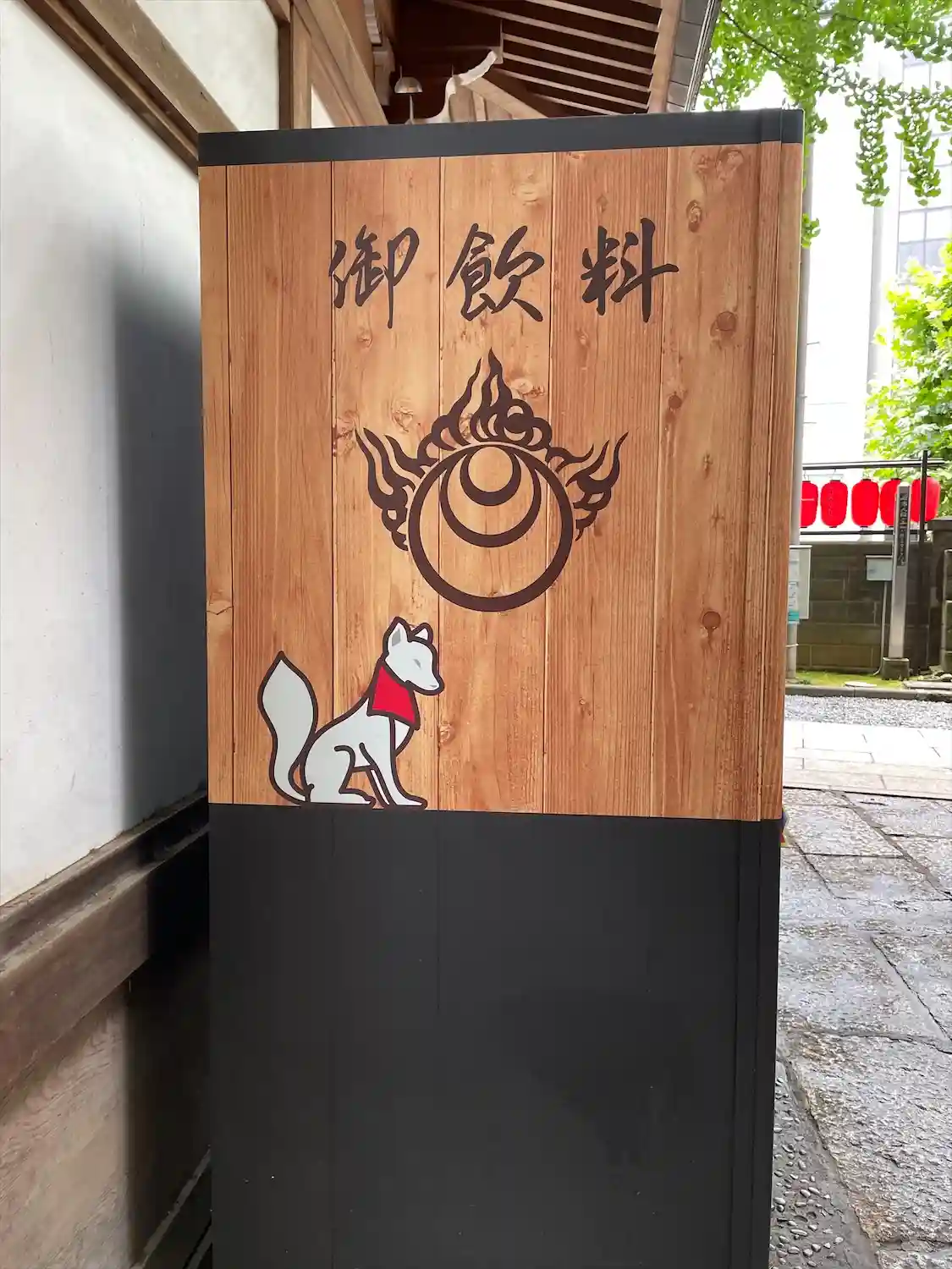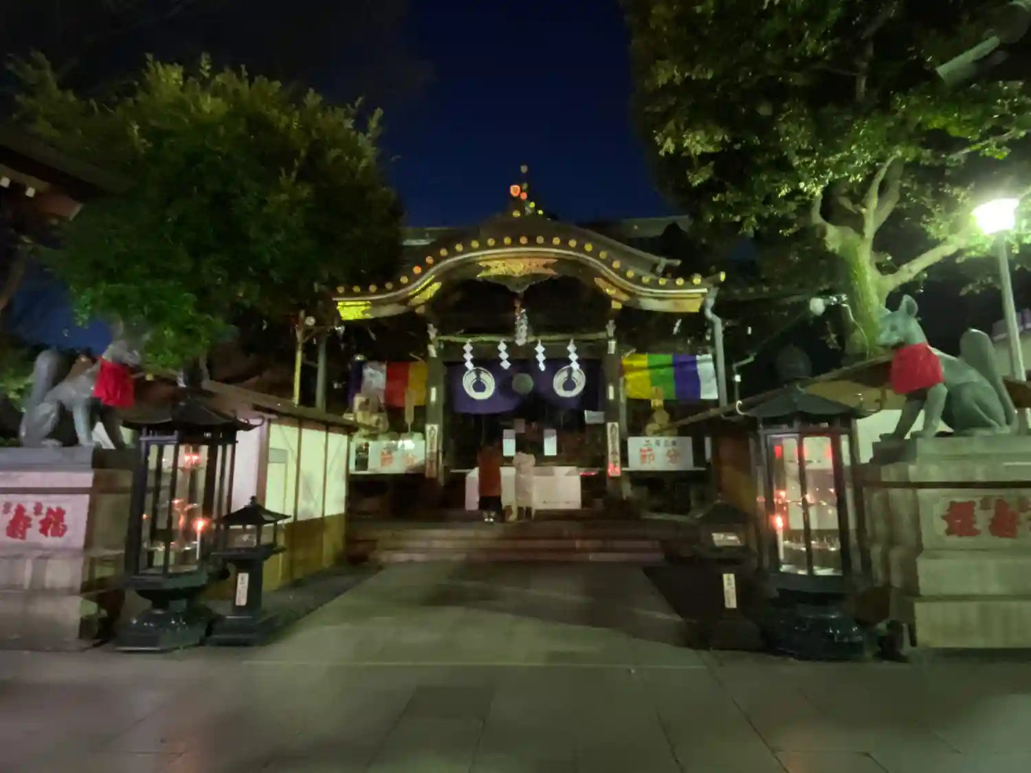 赤の提灯に囲まれた寺院です。文字上の白のマークは吒枳尼真天のマークです。