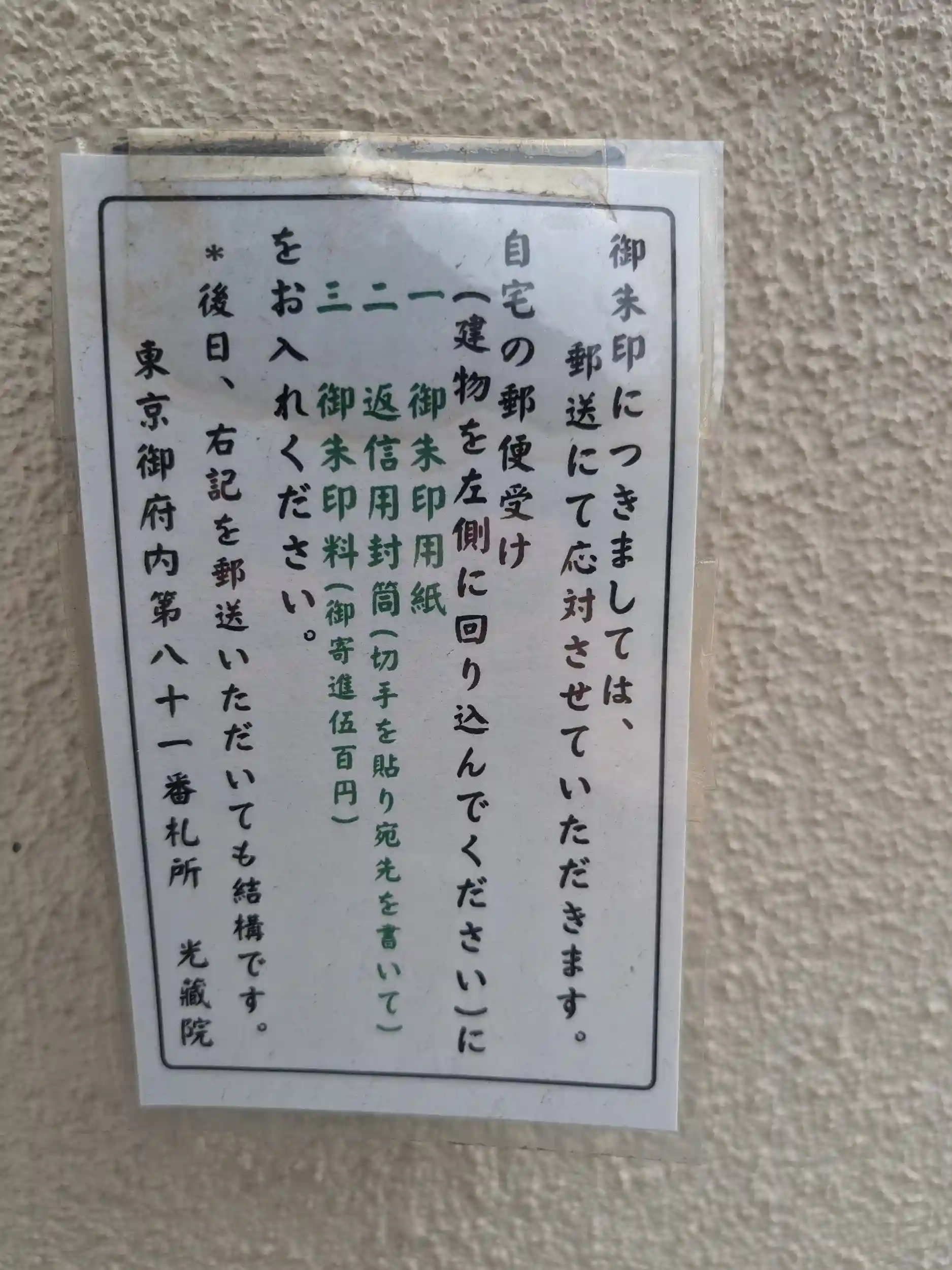 御府内八十八ヶ所霊場44ヶ所目は第81番札所の光藏院さん。事前に郵送対応の情報あったので、ご朱印書と返信用封筒と志納料を封筒に入れてポストへ投函。3−4日ほどでご郵送いただきました。ありがとうございました。