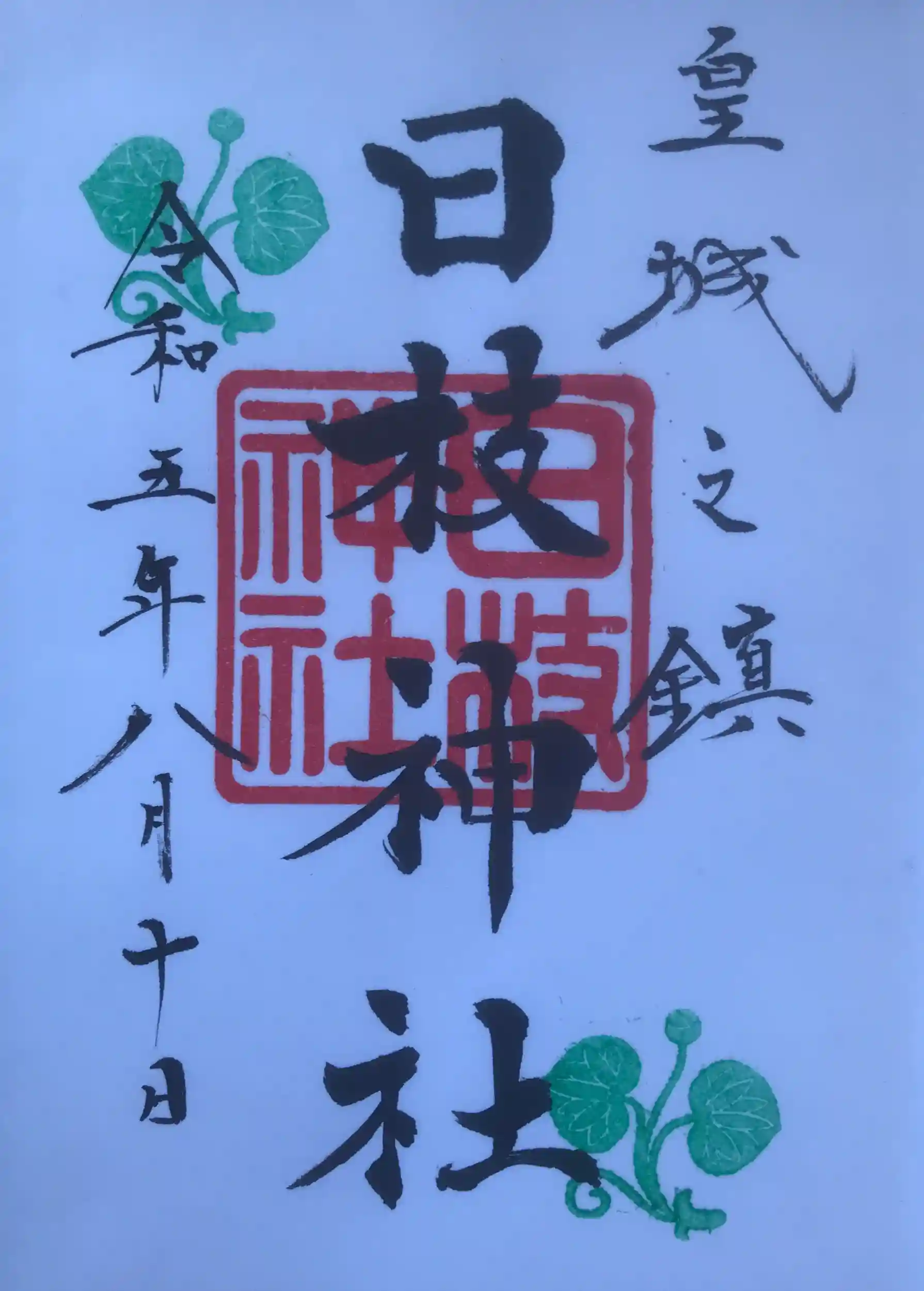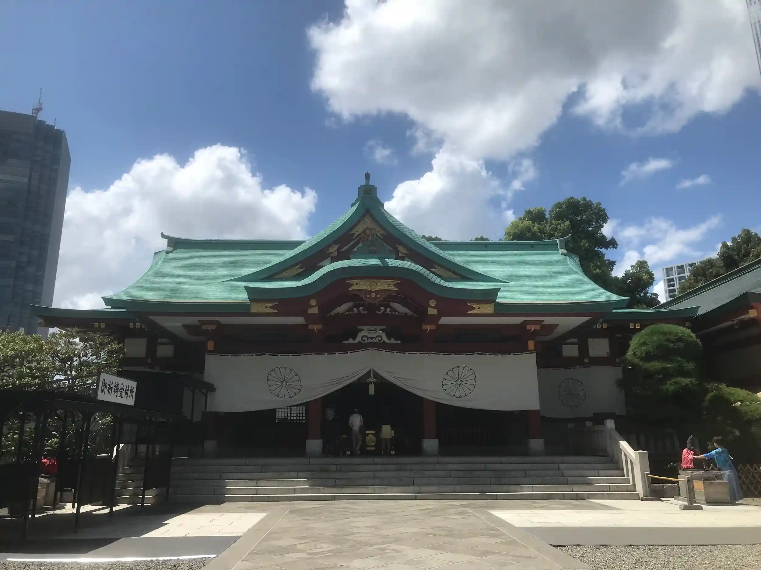 時代ごとの5種類ほどの御朱印がありましたが現代の物を頂きました。御朱印を待っている間に見た『東京五社のごあんない』というパンフレットによると今日回った明治神宮、靖国神社、日枝神社に加え大國魂神社、東京大神宮で東京五社とのこと。まだ午後1時過ぎ、行こうか、とも思いましたが、朝から暑い中歩き回ってヘトヘトだったのでやめました。