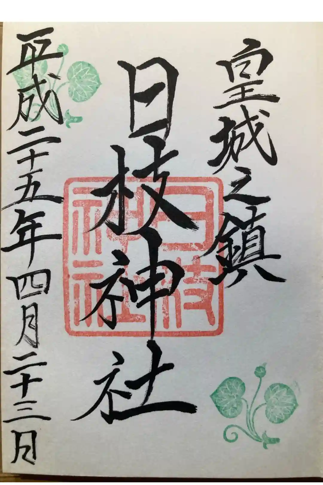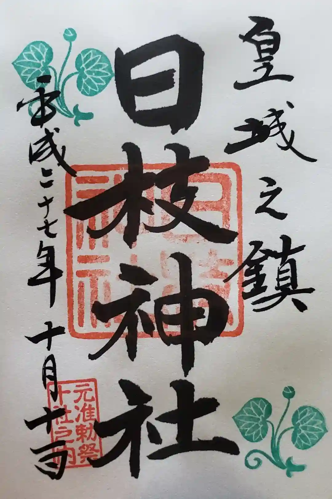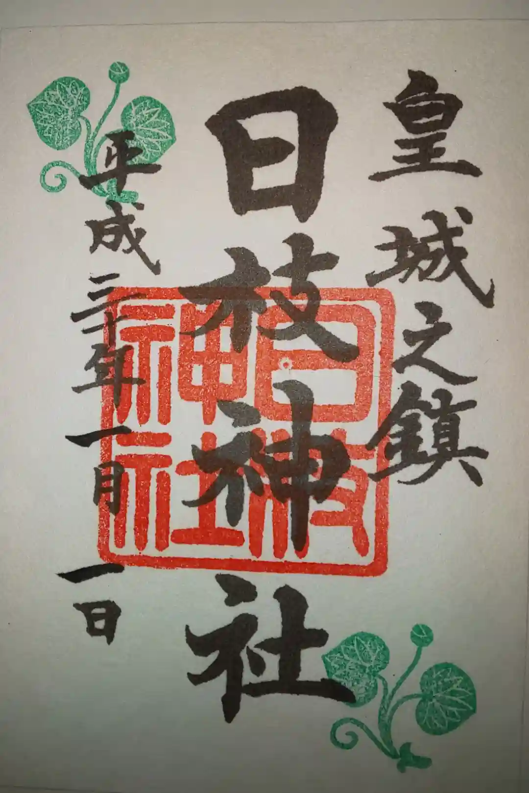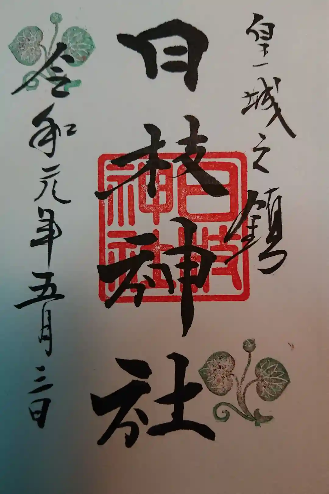 真ん中に日枝神社の印、左上と右下には日枝神社の社紋の葵の印が押されています。