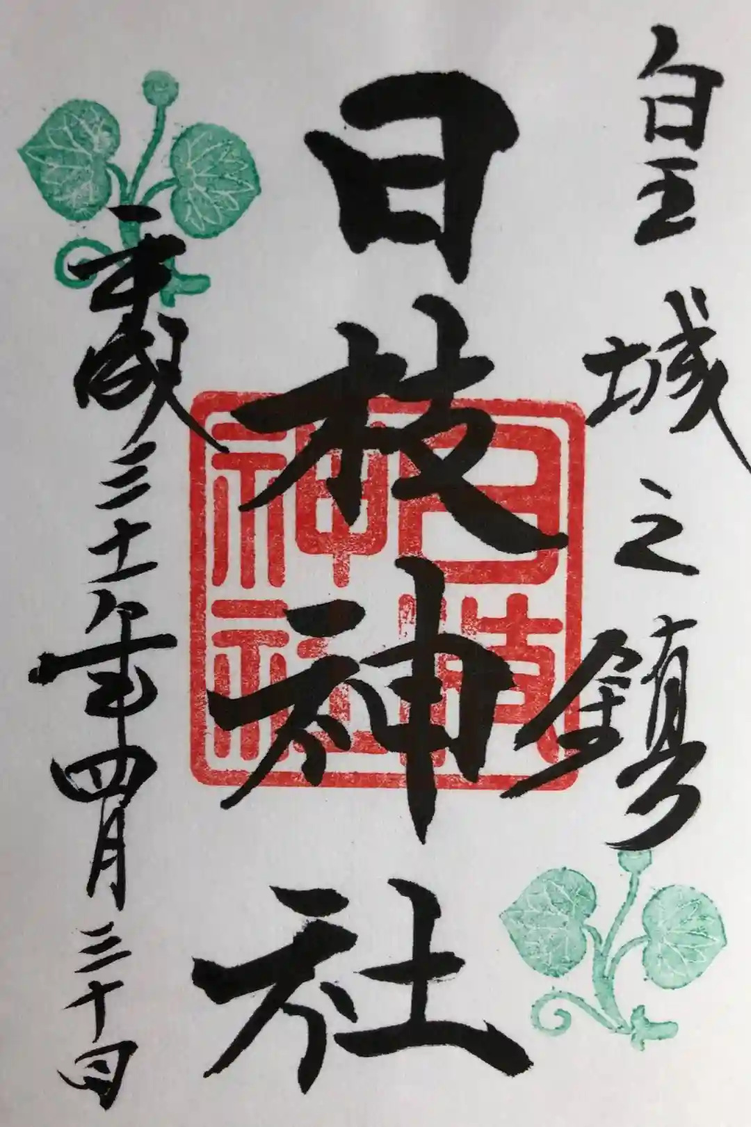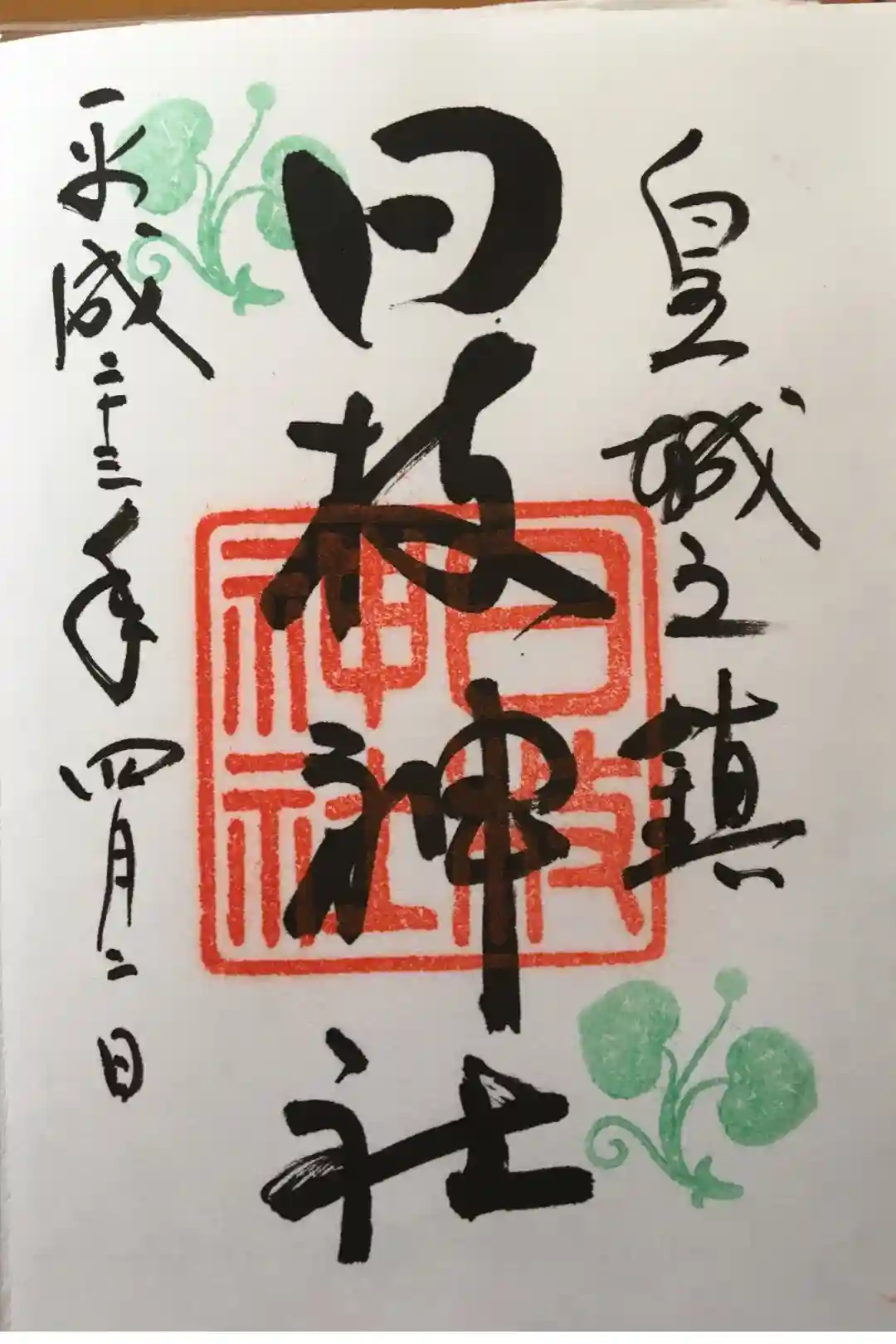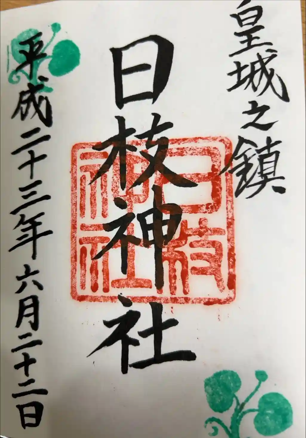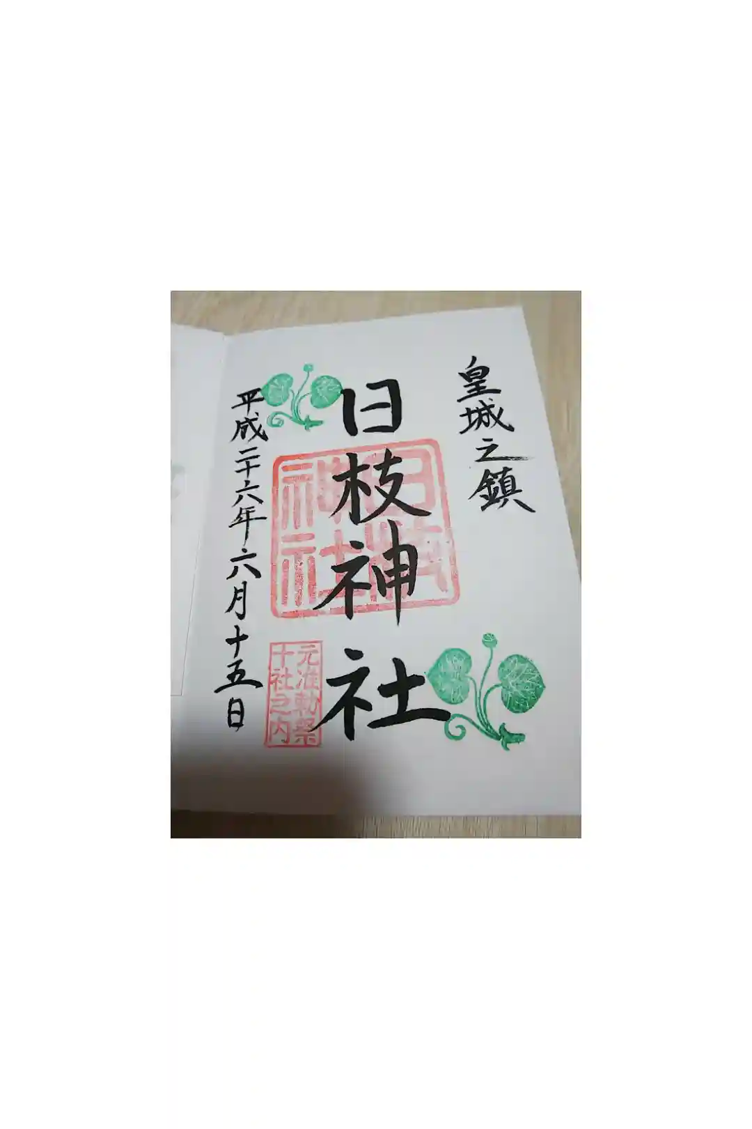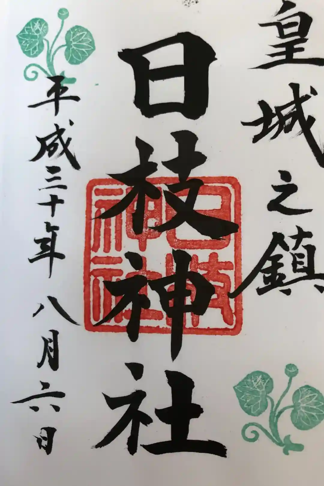 真ん中に日枝神社の印、左上と右下には日枝神社の社紋の葵の印が押されています。