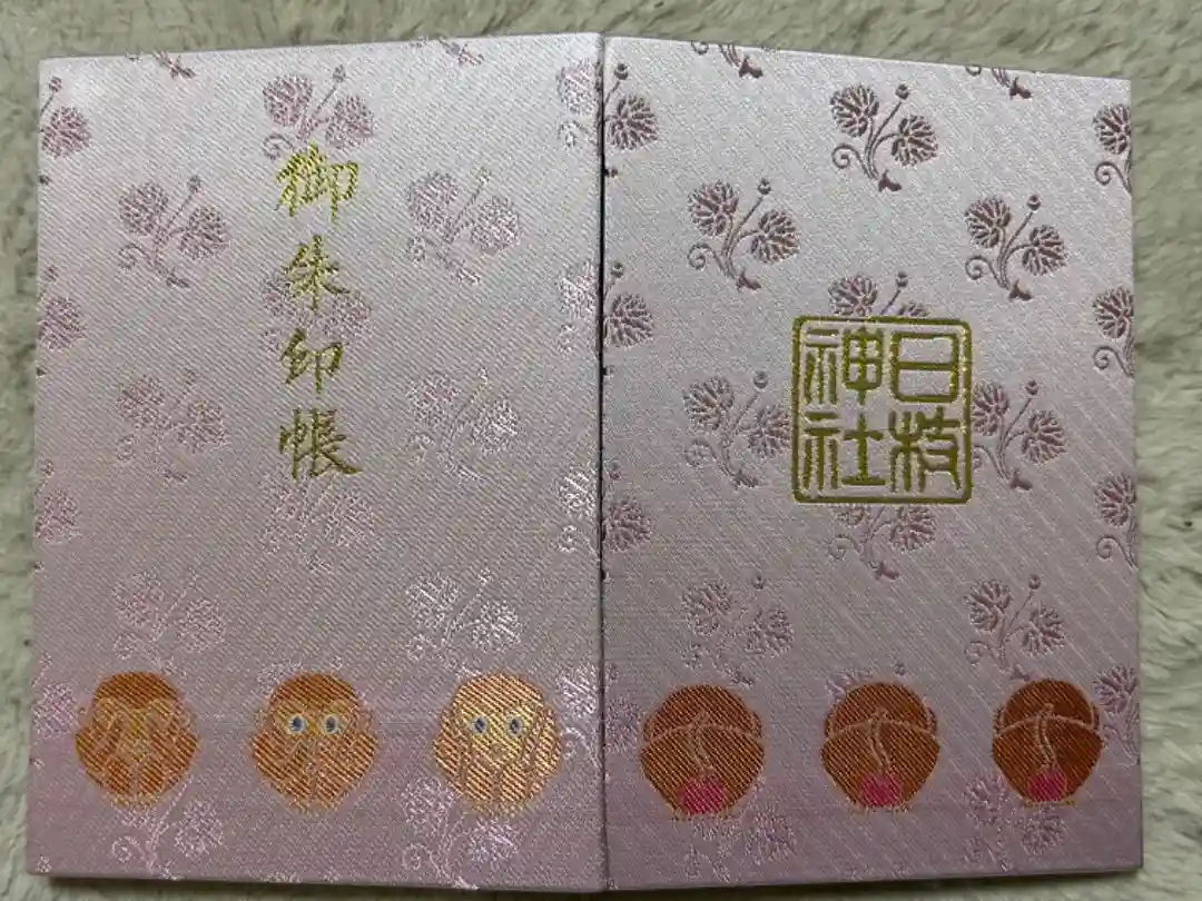 鴇色の地に葵が散りばめられ、表面には金色の御朱印帳の文字と見ざる・言わざる・聞かざるの三猿の正面のイラスト、裏面には金色の日枝神社の文字と三猿の背面のイラストが描かれています。